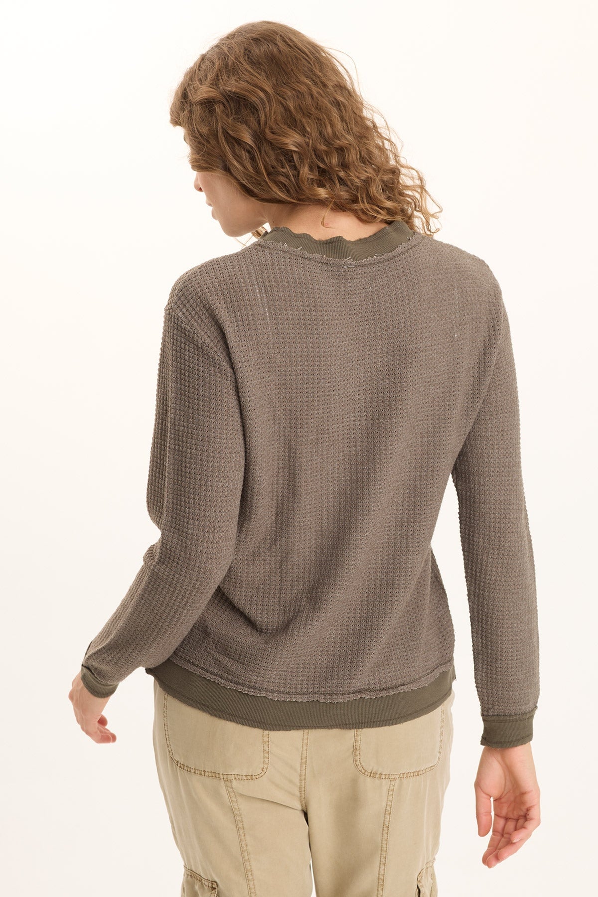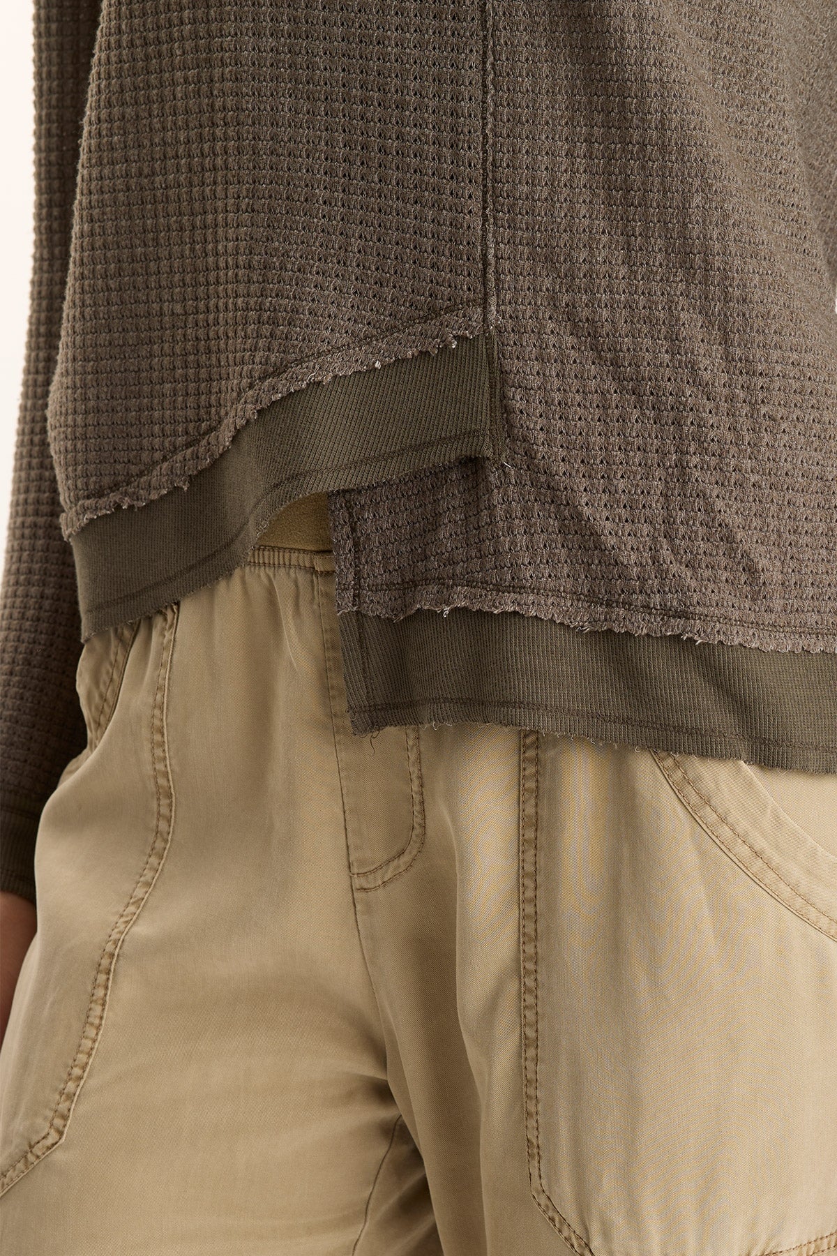 Two panels overlap for an asymmetrical and unprecedented style. In soft, cozy thermal, Alvis features contrasting trim at the collar, cuffs, and hem with some raw-edge detailing for the ultimate novelty style---because our idea of comfort is anything but boring!