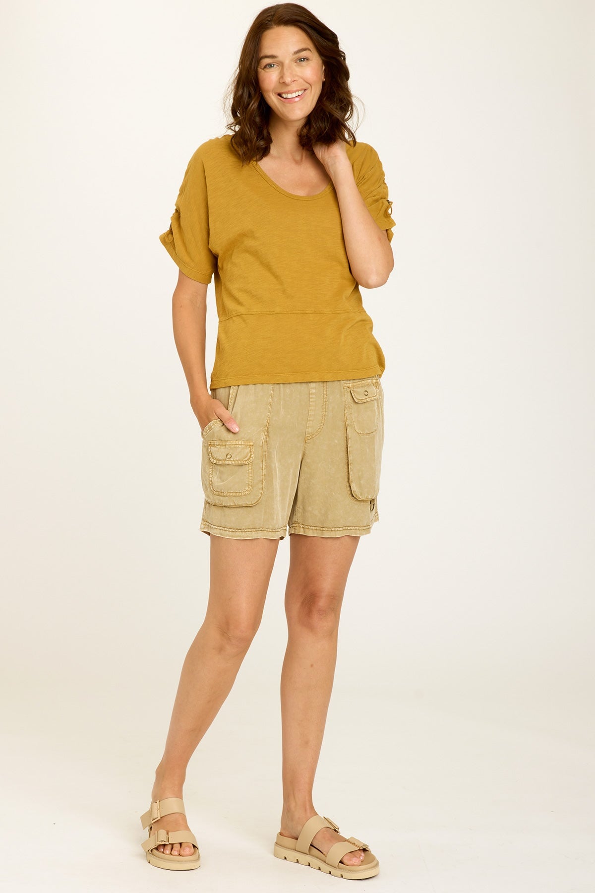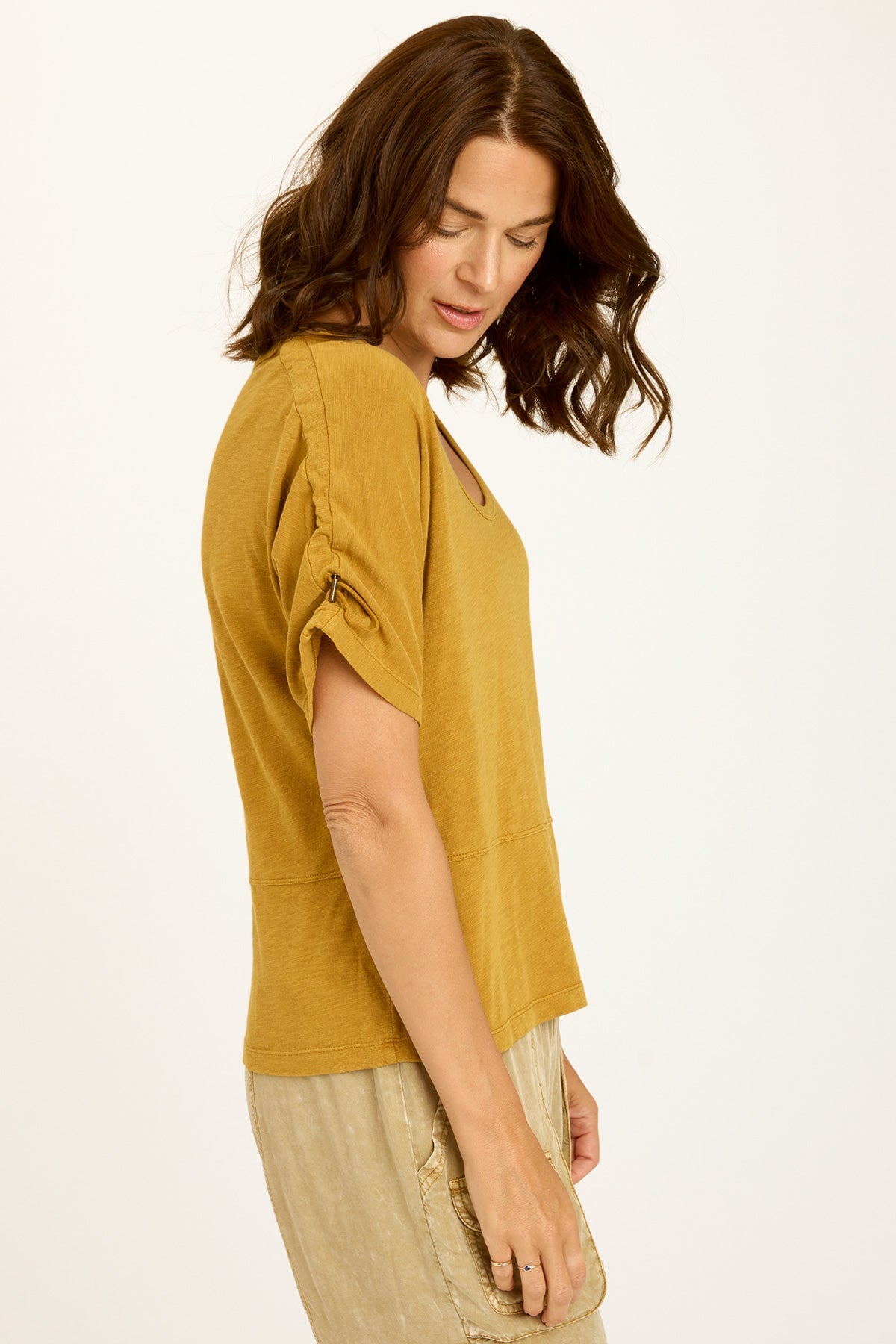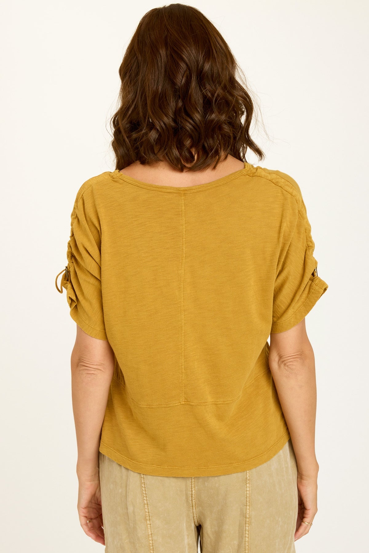 Ashla features a wide, dipped neckline and elongated sleeves with adjustable ruched channels. Unique seaming and soft, stretchy jersey material finish off this unexpectedly-detailed upgraded tee.