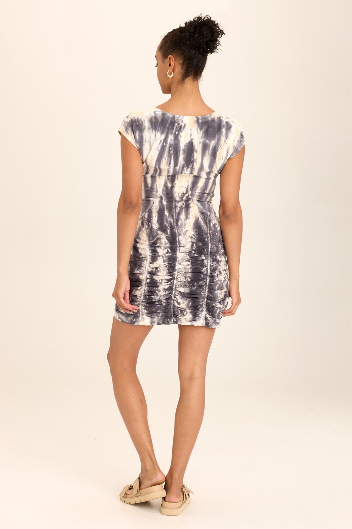 This stretch poplin dress features short sleeves, ruching on skirt, jersey inserts in the bodice for an impeccable fit, and style lines for added structure.