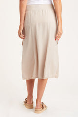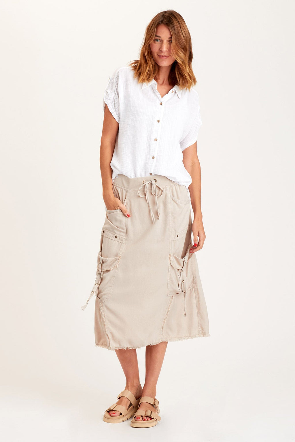 Do you love dramatic pockets like we do? If so, we should totally be friends with the Bellamy Skirt. Exaggerated cargo pockets with snap tape and raw edges compliment this slightly A-lined midi skirt.