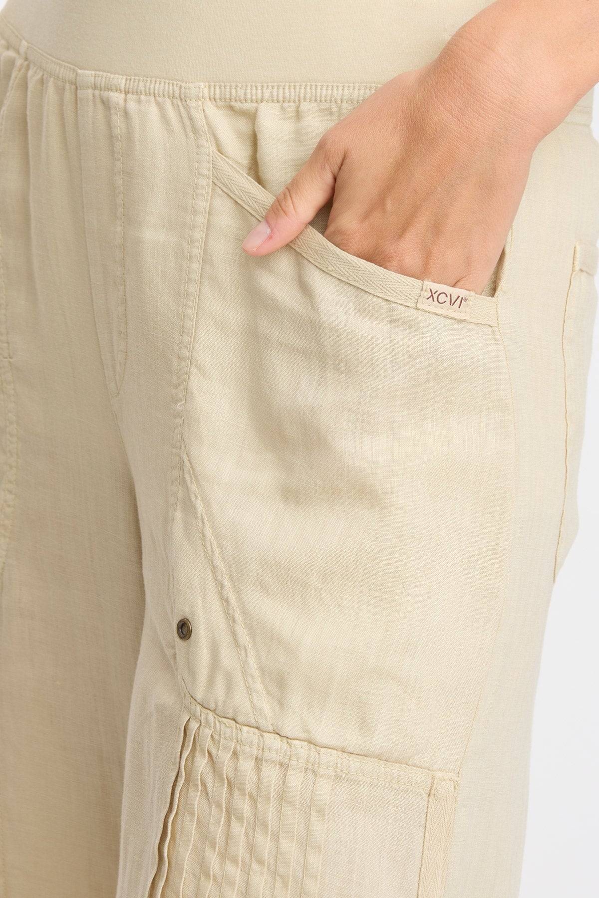 Pintuck pleats add textured detail to this pull-on elastic waist, Light Linen gaucho pant. A raw-edge hem, twill tape and antique brass hardware details, and a dart at the back pockets for a contoured fit finish off the look of this slightly cropped trouser.