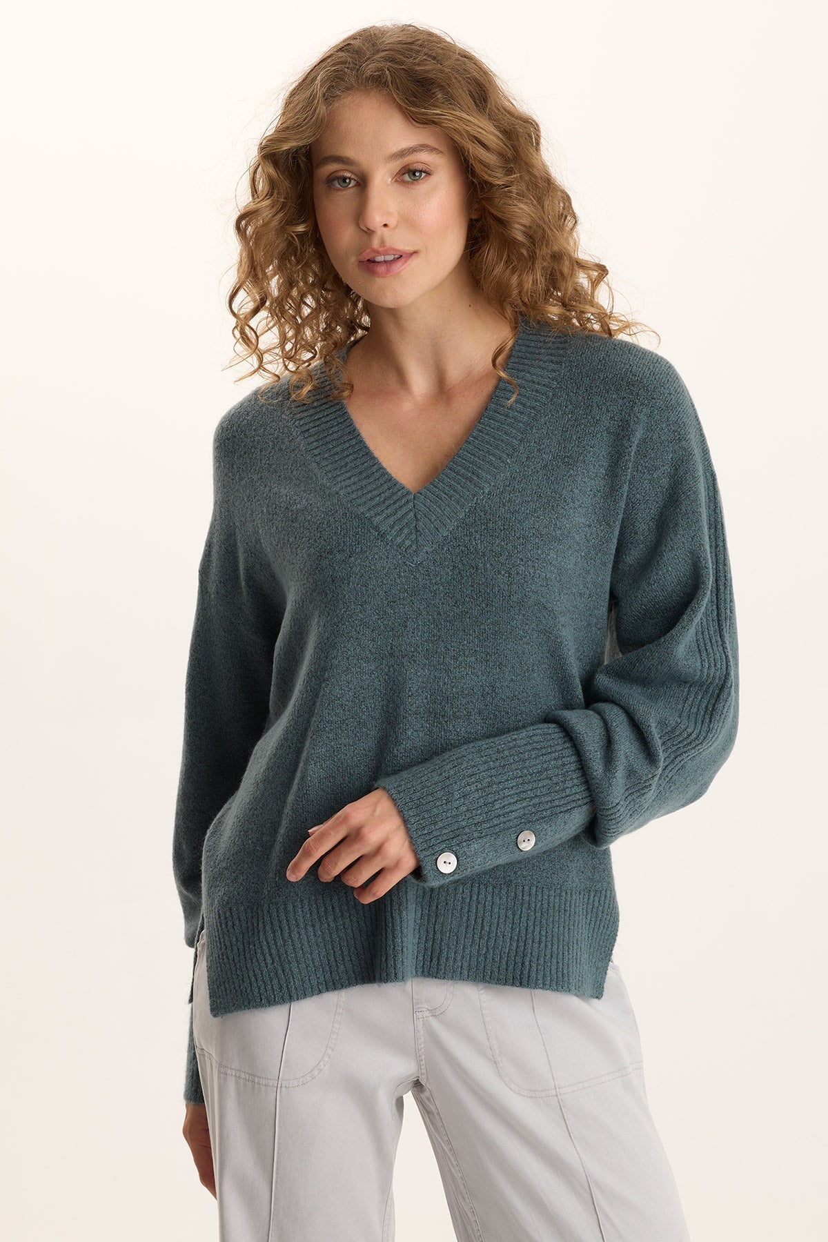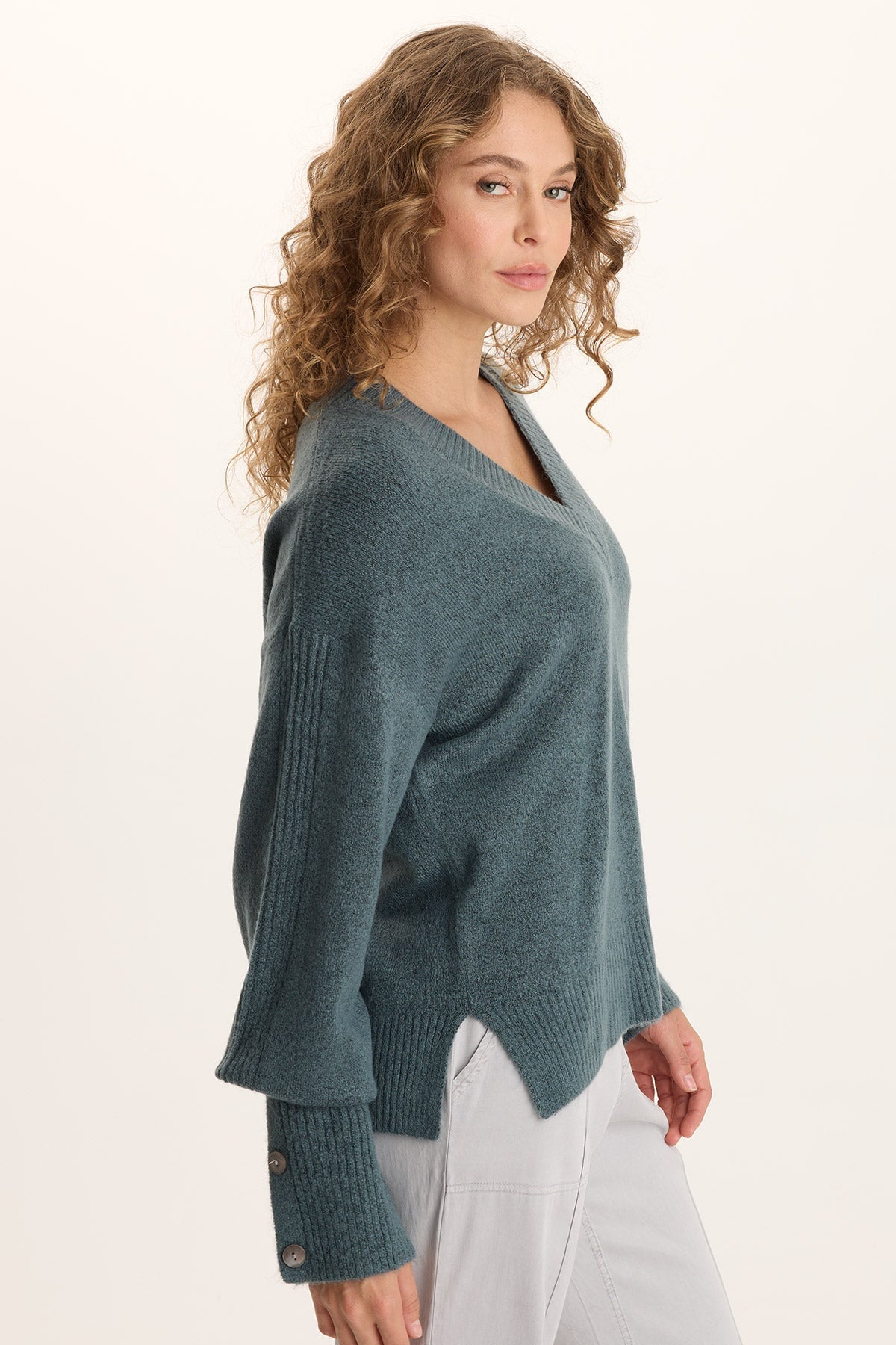 Voluminous sleeves, a relaxed fit, and v-neck collar bring out the ultra-cozy feel of this sweater in our soft Mirelli Knit.