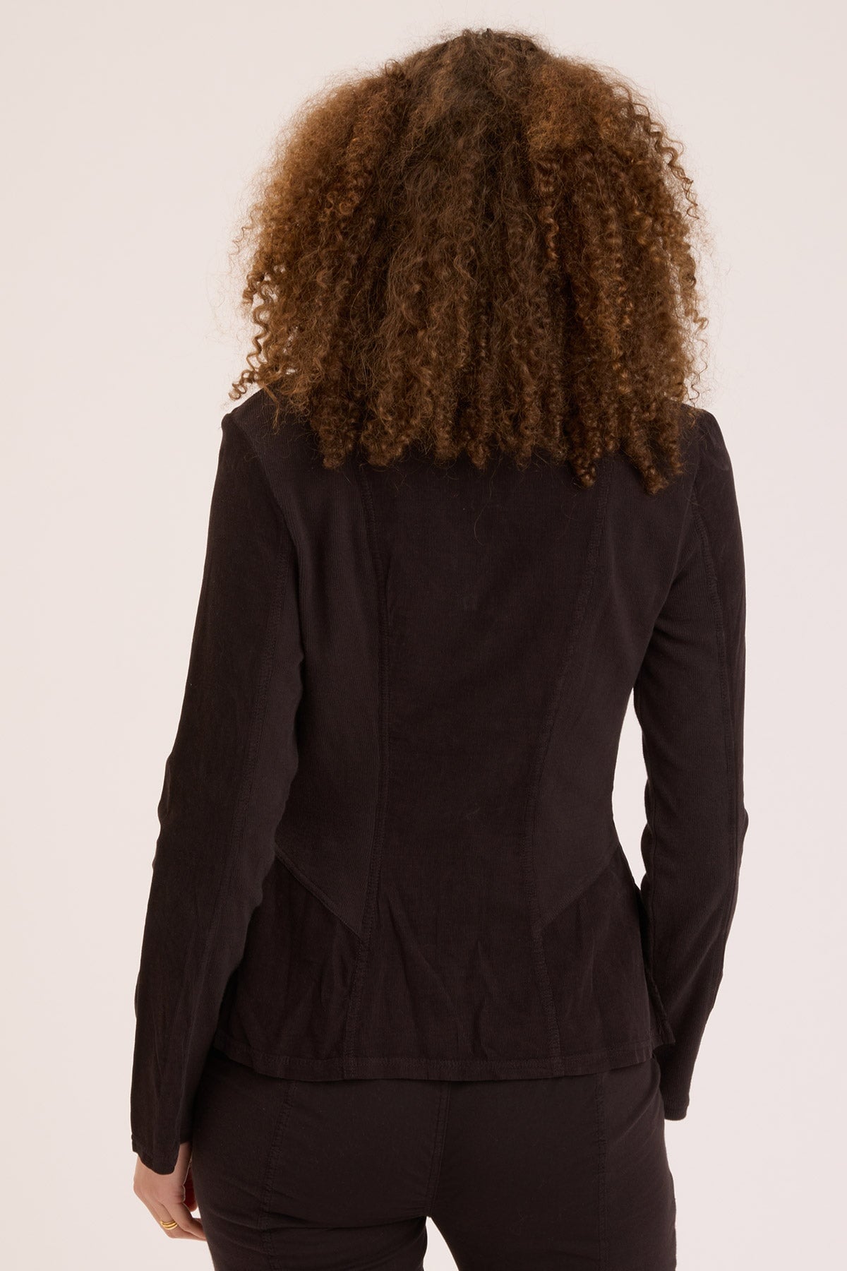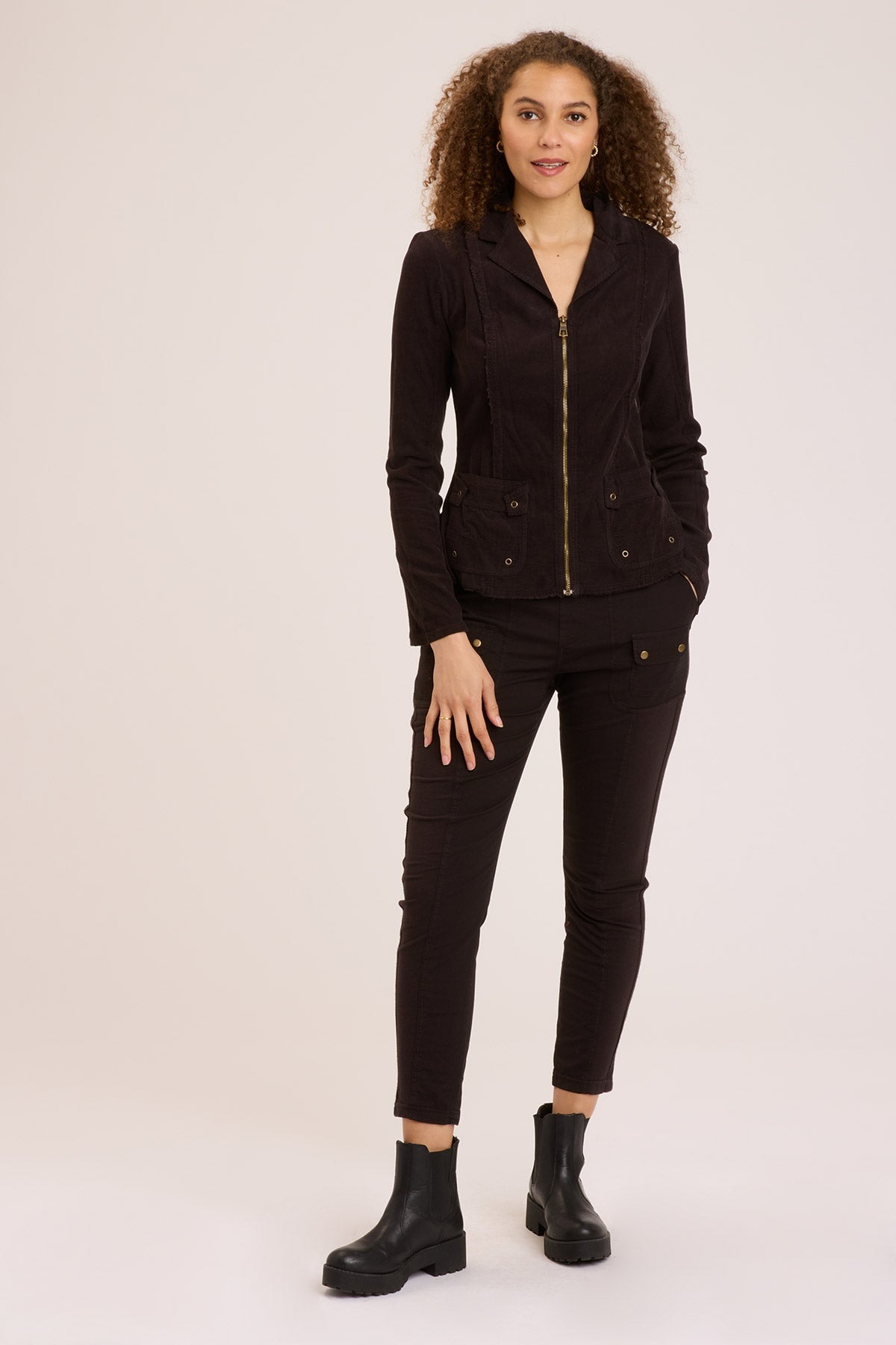 Hardware and raw edges are highlighted in our Raphael Blazer. Fabric-mixed contrasting panels, eyelets along the pocket edges, and brass ring snaps are just a few of the details throughout this interesting jacket.