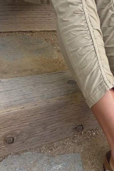 Cinchable side cords grace this v-neck slub jersey top; also featuring a front yoke, dolman sleeves, and raw-edge details throughout.