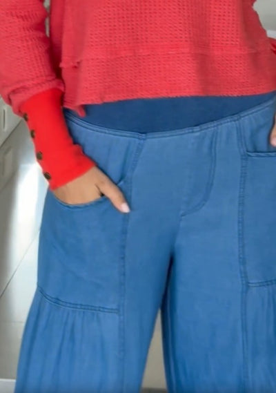 Tiers and denim is all anyone needs! This wide leg has both! With front pocket, clean back and a pull-on elastic waistband.