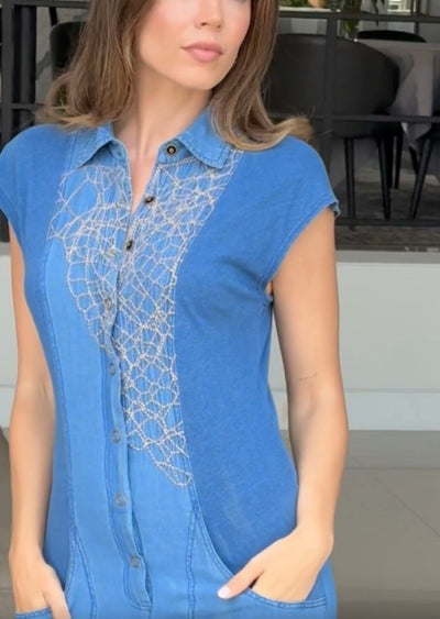 Gimme Gemmell! This throw on and go piece features a hand drawn geometric embroidery, brass ring snap closure, two front pockets and a traditional collar.