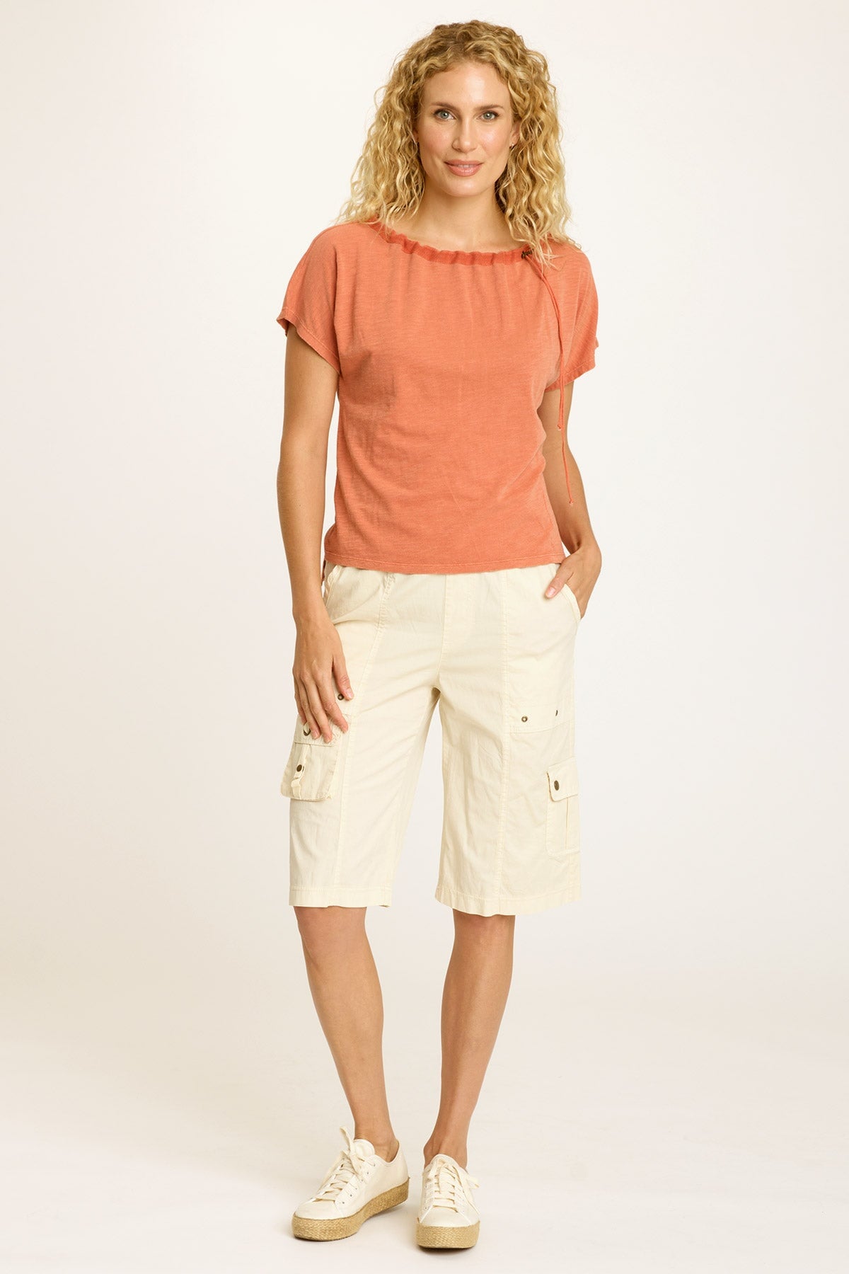 A cinchable, adjustable drawstring neckline offers the unique opportunity to wear Exelda off the shoulder or on. A slightly boxy fit keeps things casual and cute, while stretch jersey ensures ultimate comfort.