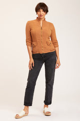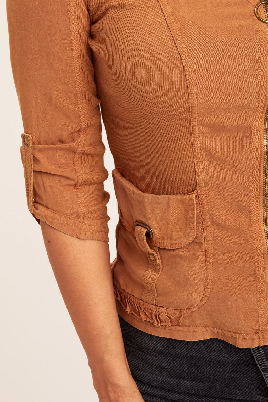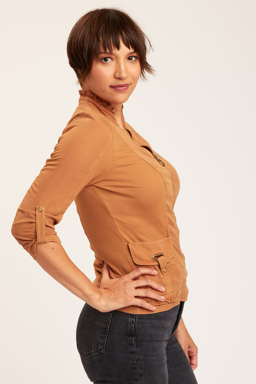 Ruffles, ruffles, everywhere! We have ruffles here and there! Ruffles are featured at the mock neck collar and below front pockets, extending through the side panels. With tabbed 3/4 sleeves and brass details abound, Fraser is a cute go-to jacket!