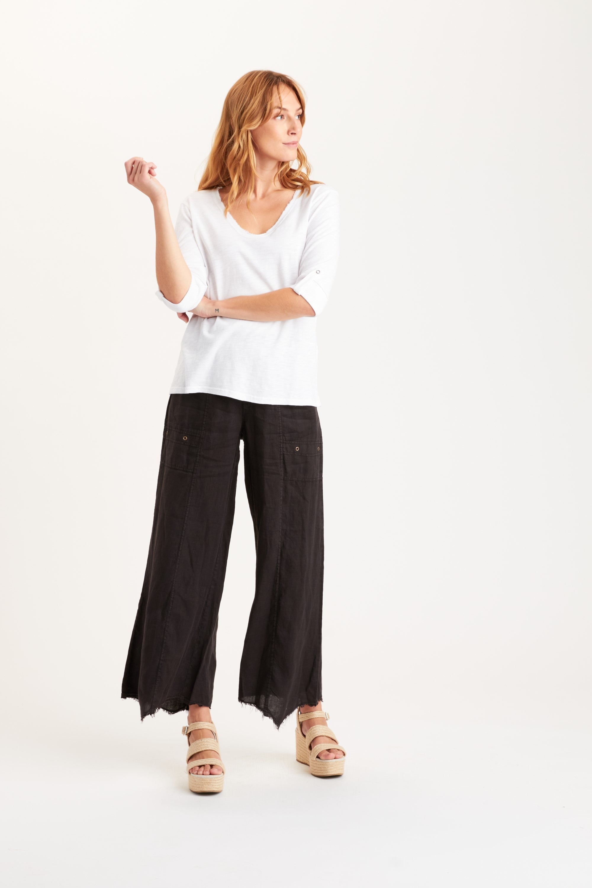 Gaston Pant features raw edges on an asymmetrical leg opening. With a pull-on elastic waist and a full length cut, Gaston delivers function and fun!