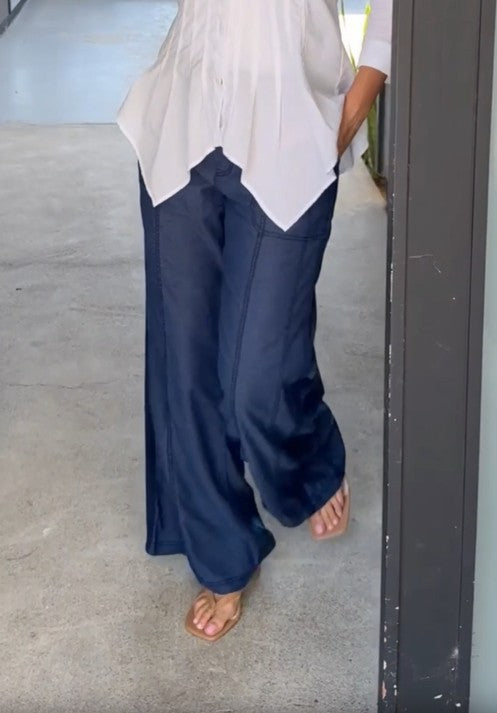 A double seamed leg pair up with twill tape details and a pull-on waist to make this cute wide leg pant.