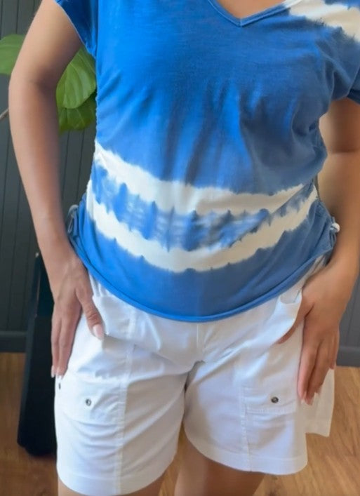 - Waistband: 4" Elastic Ruched Side Panels with Drawstring