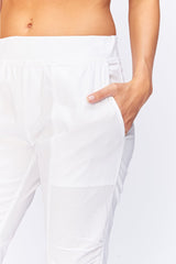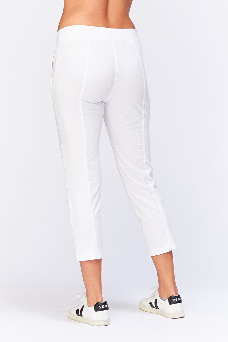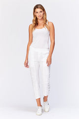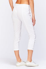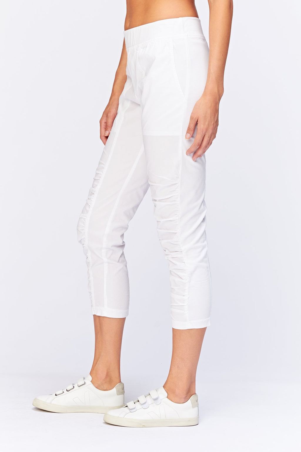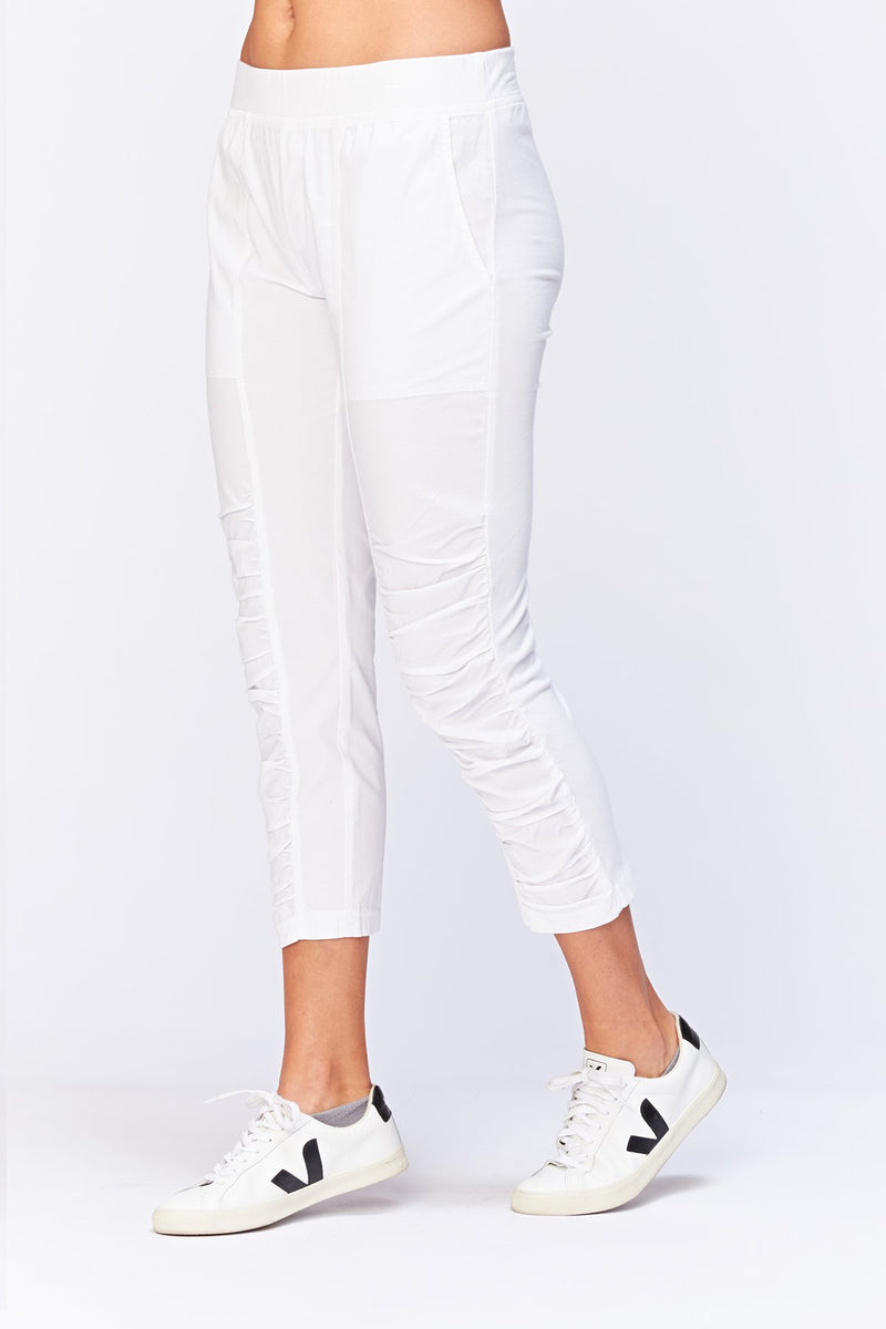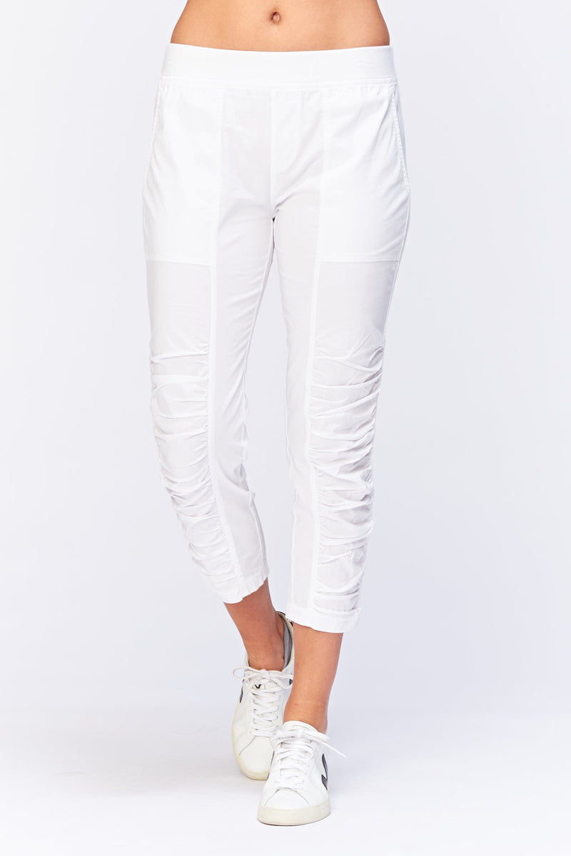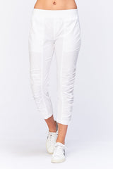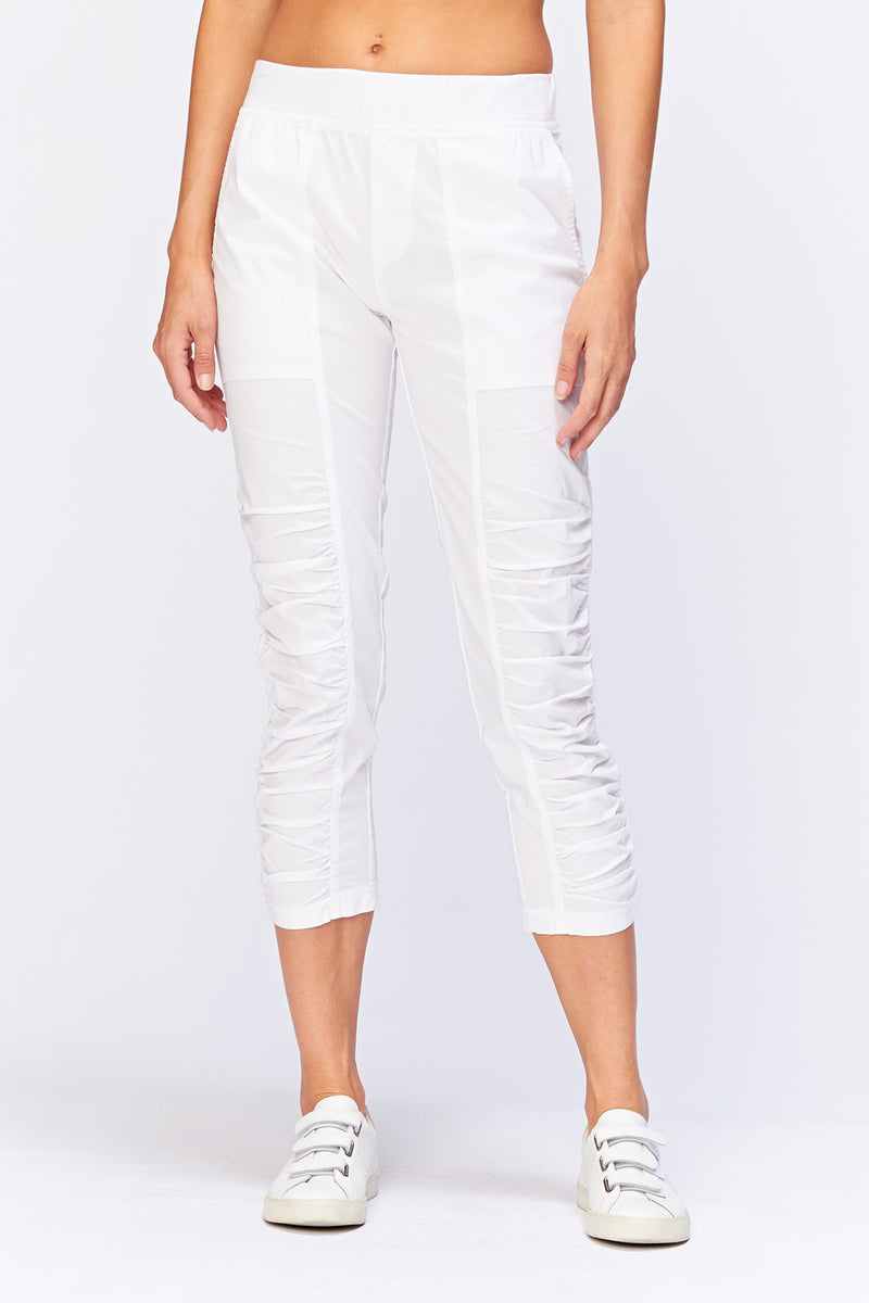 A variation on a classic. This crop features an elastic pull-on waistband, two front pockets, ruching on leg front, and jersey side inserts for an impeccable fit.