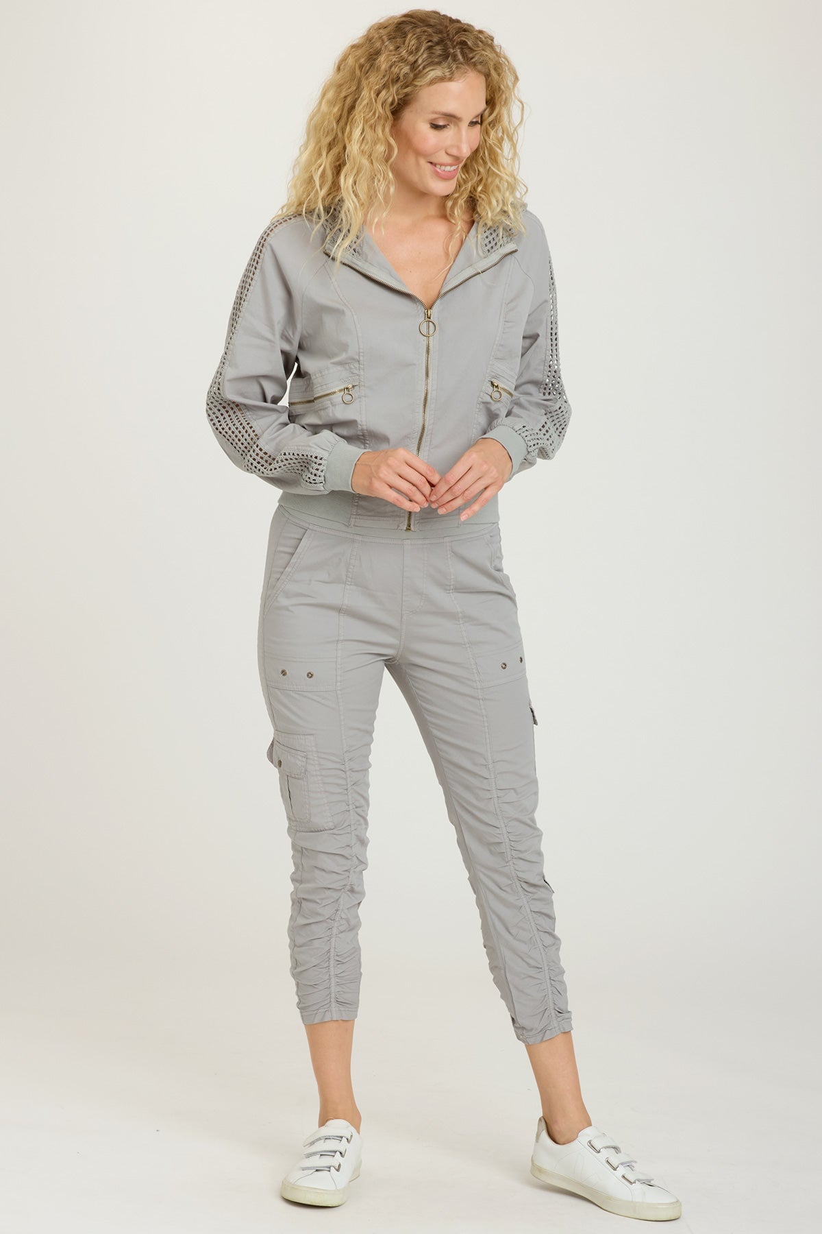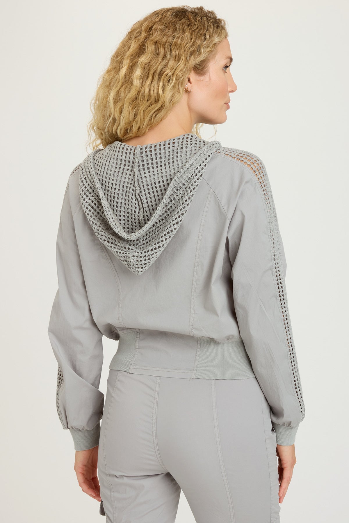 A mesh strip down the length of Gillian’s sleeve and matching mesh hood bring on the unexpected detail in this poplin bomber style with a semi-cropped fit. Diagonal antique brass zippered pockets sit on either side, while ribbed cuffs and a banded hem top it all off.