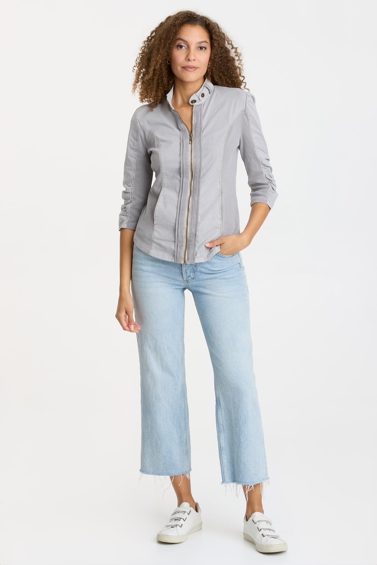 She's back! A stylish, elevated, track jacket-inspired piece of lightweight outerwear, Janet is all for you! Featuring a stand collar with button details, rib inserts at the sides and at the 3/4 sleeves for an impeccable and comfortable fit, twill details at the zipper front, two front in-seam pockets, and ruching on the sleeves and back, Janet is as full of details as she is life!