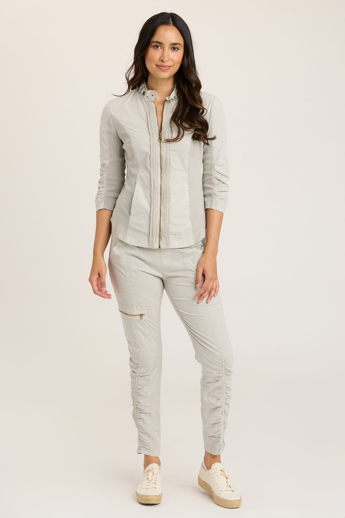She’s back! A stylish, elevated, track jacket-inspired piece of lightweight outerwear, Janet is all for you! Featuring a stand collar with button details, rib inserts at the sides and at the 3/4 sleeves for an impeccable and comfortable fit, twill details at the zipper front, two front in-seam pockets, and ruching on the sleeves and back, Janet is as full of details as she is life!