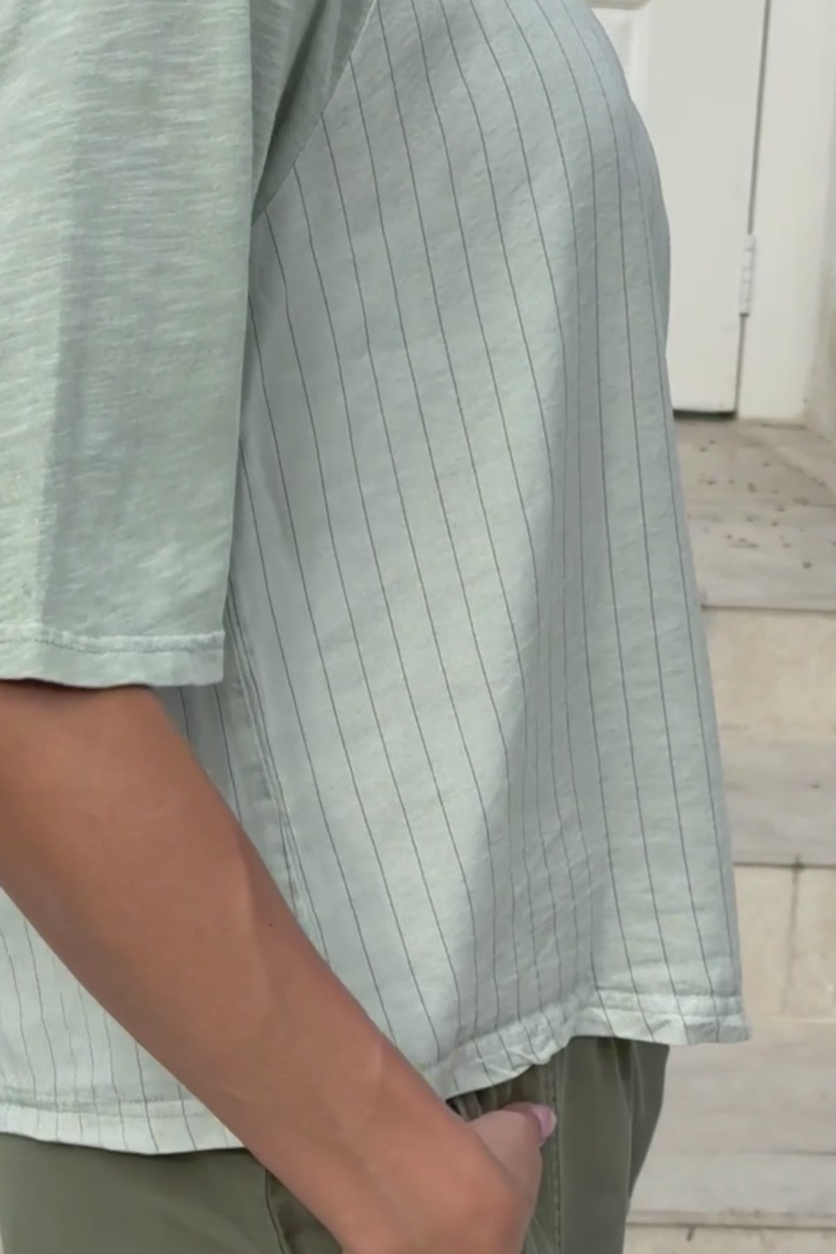 Raglan sleeves, a subtle pinstripe and a snap-up back detail are on display in this mid length short sleeve tee.