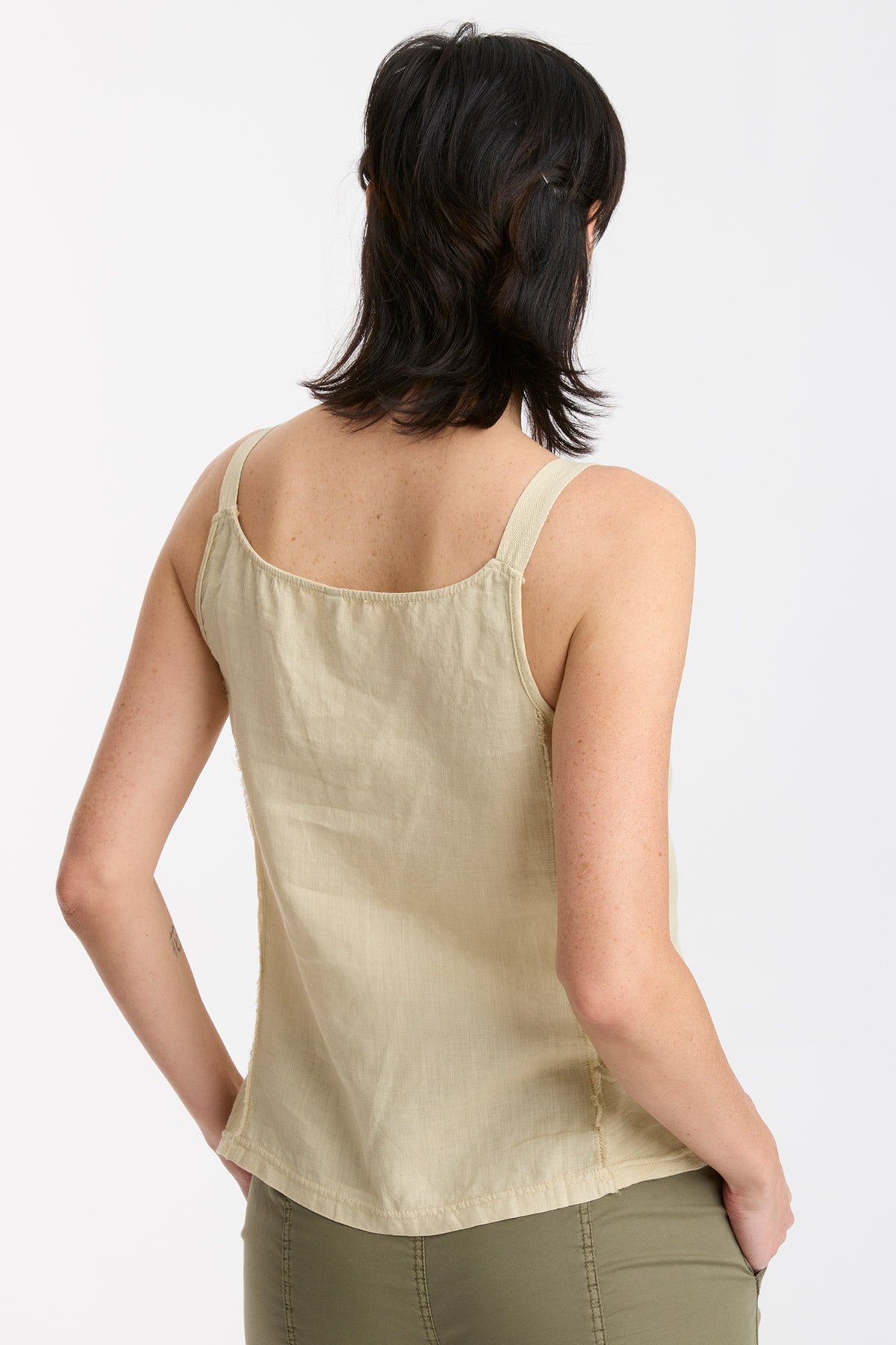 A twill tape-strapped tank with asymmetrical front seams, raw-edge details on the patch pockets, and contrasting back side panels in slub jersey.