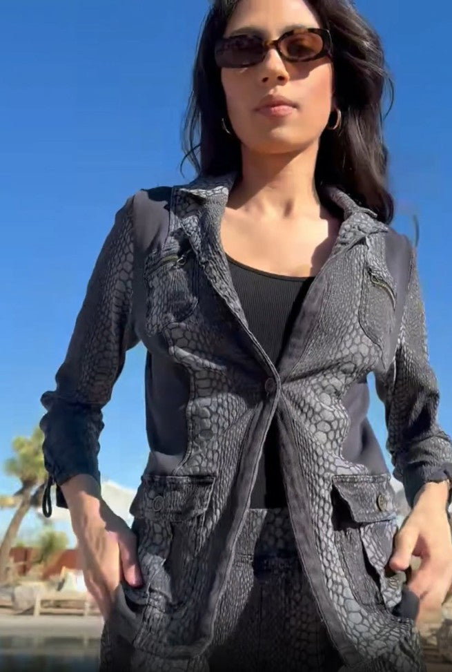 In unique textured Camille Jacquard, the Kirkyln Blazer features a split collar, stretchy inserts for ease of movement, and antique brass hardware adorning each pocket. With adjustable cords at each cuff and a flexible yet fitted silhouette, Kirklyn is here to spice up your style!