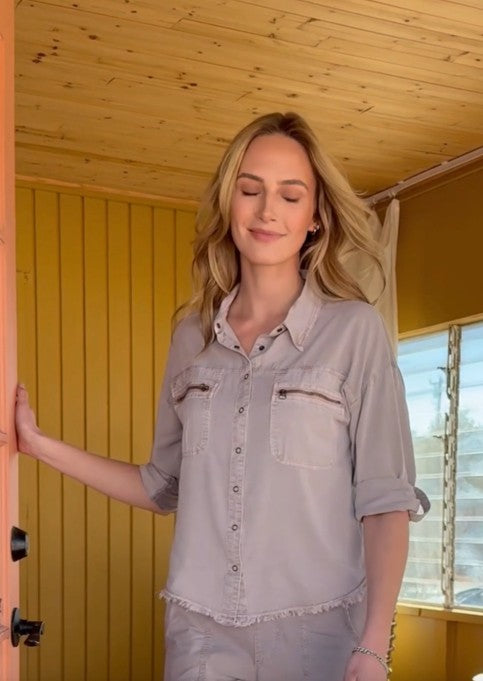 Tabbed three-quarter sleeves, zippered breast pockets, a classic collar, and a raw-edge hem round out this utility-inspired cargo shacket.