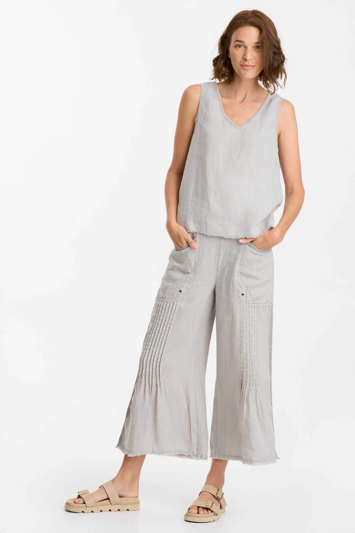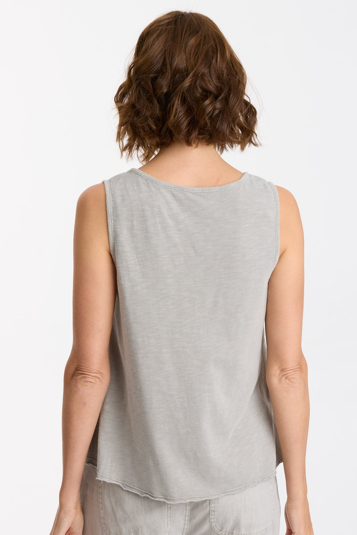 A lightweight linen bra-friendly v-neck tank with two functional ring snaps at the side seams, a slub jersey contrasting back panel, and a raw-edge hem.