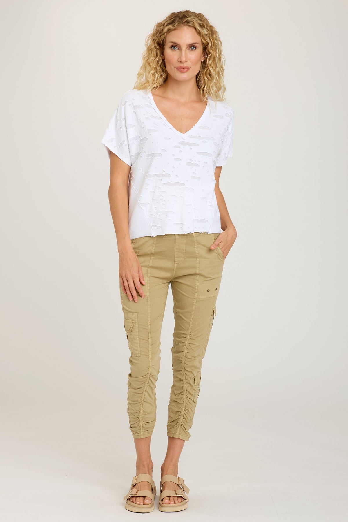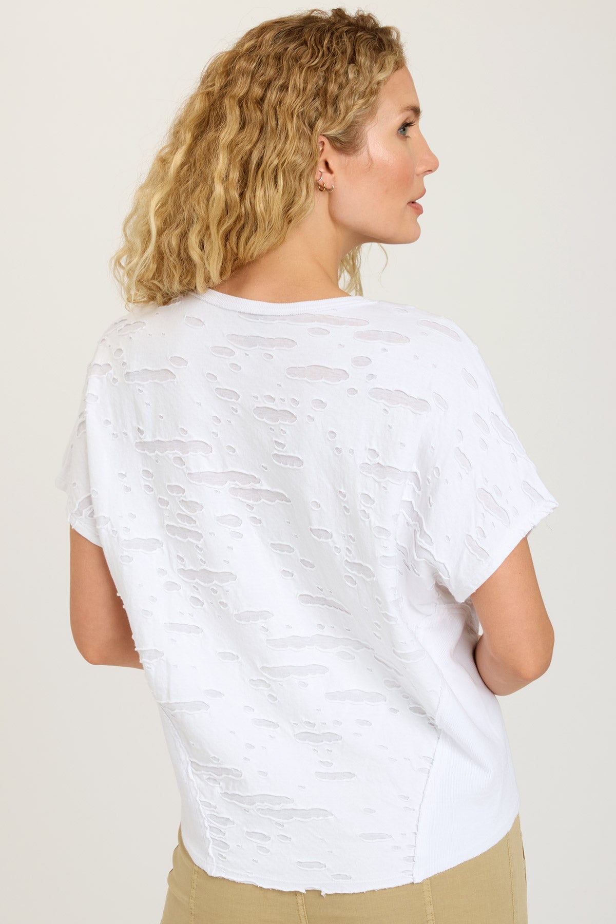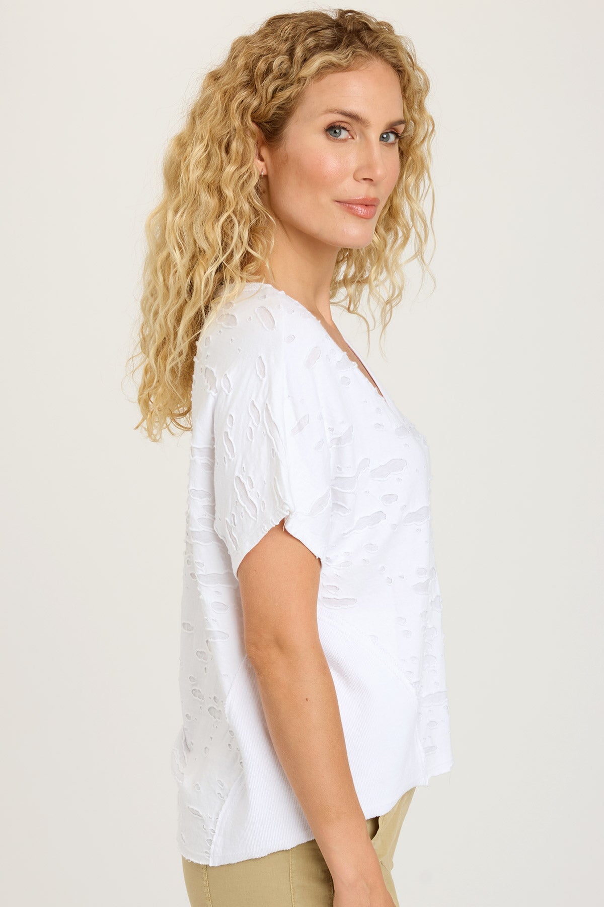 In our new Ripped Jersey fabric, the distressed Langston Top channels that grunge look for the ultimate cool. A raw-edge hem with rib side panels, boxy look, and v-neck cut finish off this tee with a twist!