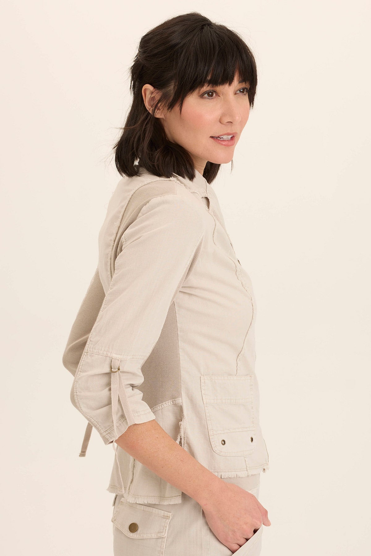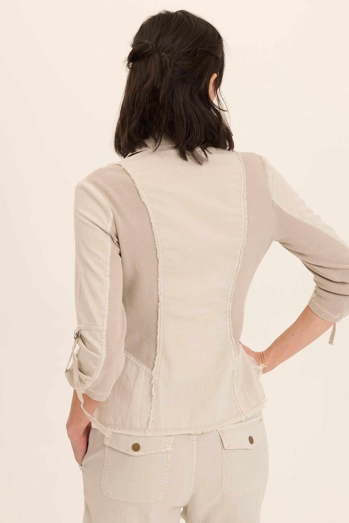 Your favorite, now in Cotton Linen! Hardware and raw edges are highlighted in our Raphael Blazer. Fabric-mixed contrasting panels, eyelets along the pocket edges, and brass ring snaps are just a few of the details throughout this interesting jacket.