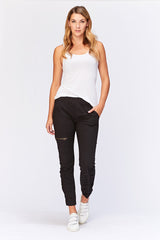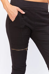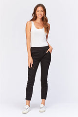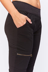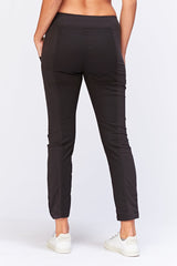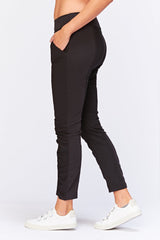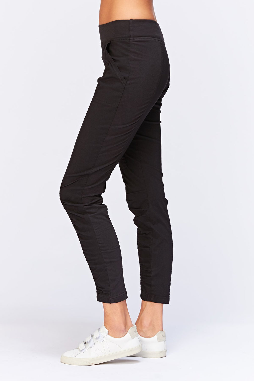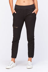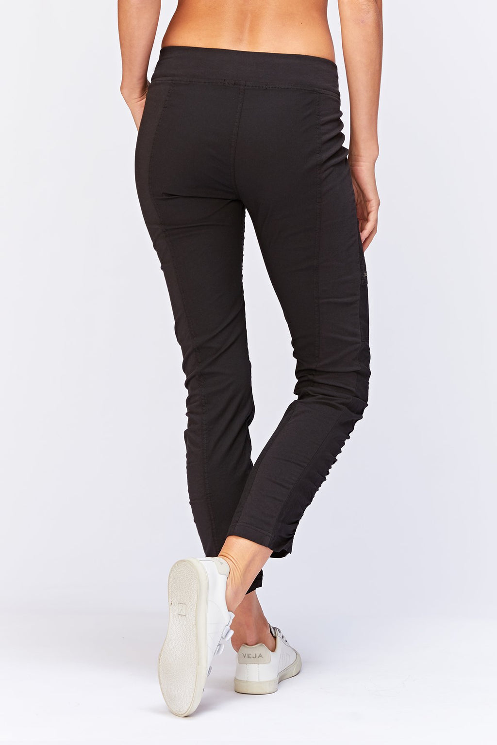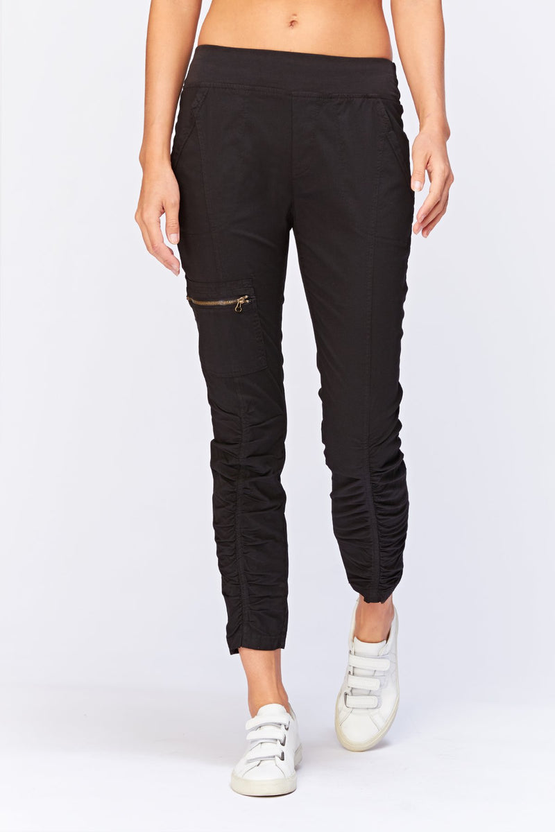This stretch poplin pant features jersey side inserts for an impeccable fit, a jersey elastic pull-on waistband, two front pocket, one side zip pocket, and ruching on leg front.