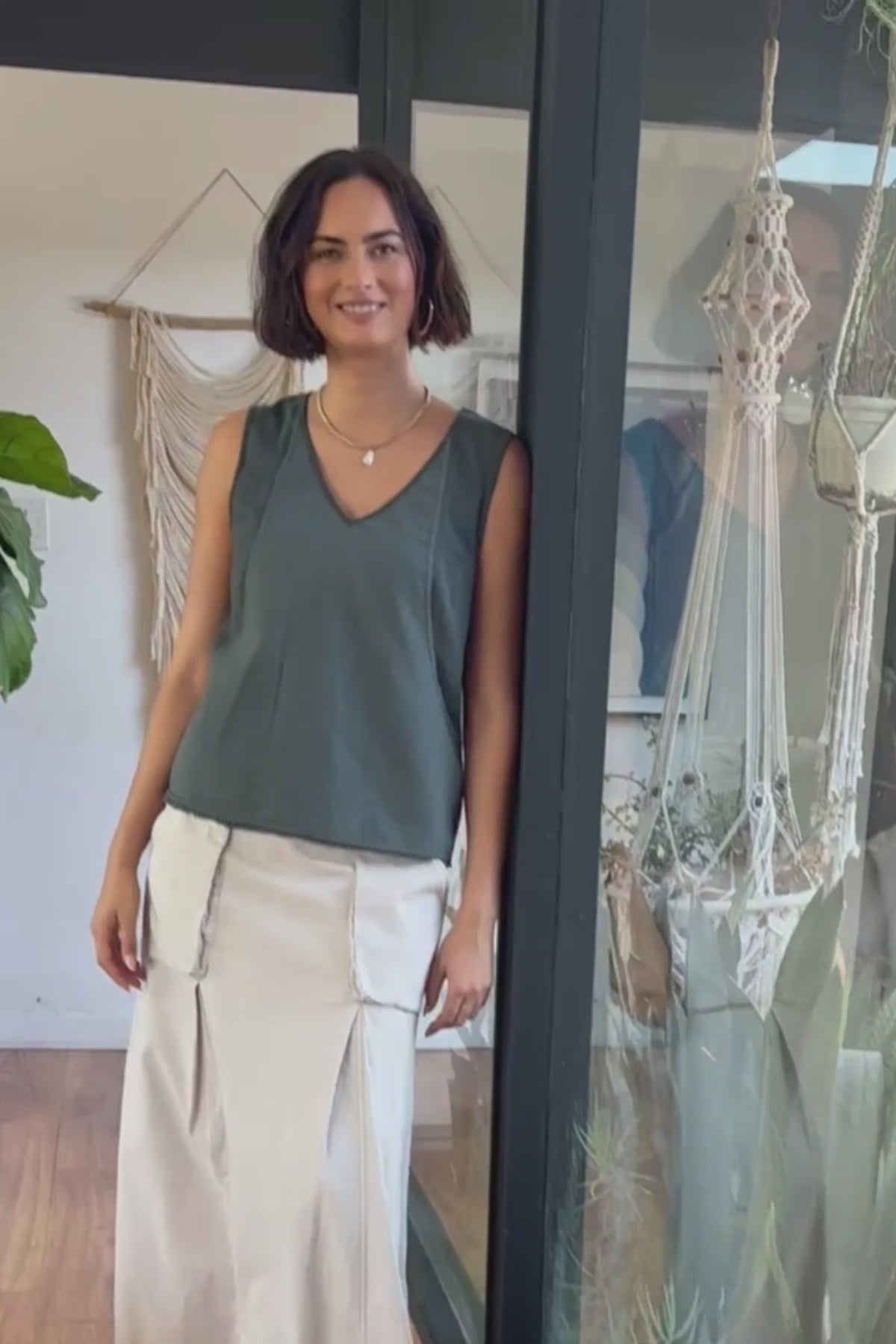 Mazie Linen/Jersey V-Neck Tank in Hawthorn Leaf