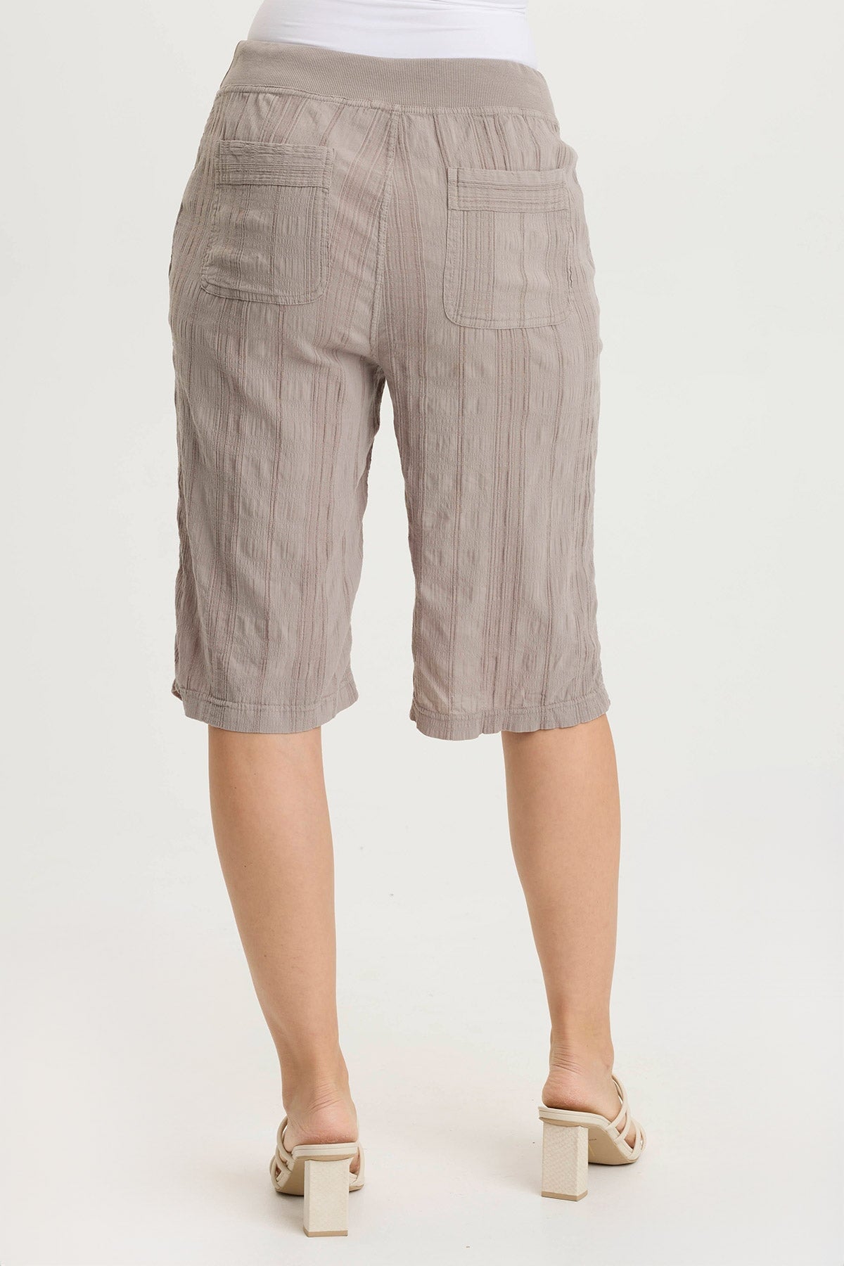 I love these knee length shorts - such a hard length to find- they are so flattering. The fabric is soft and I love the subtle pattern. Fit runs a little big so think about ordering a size down.