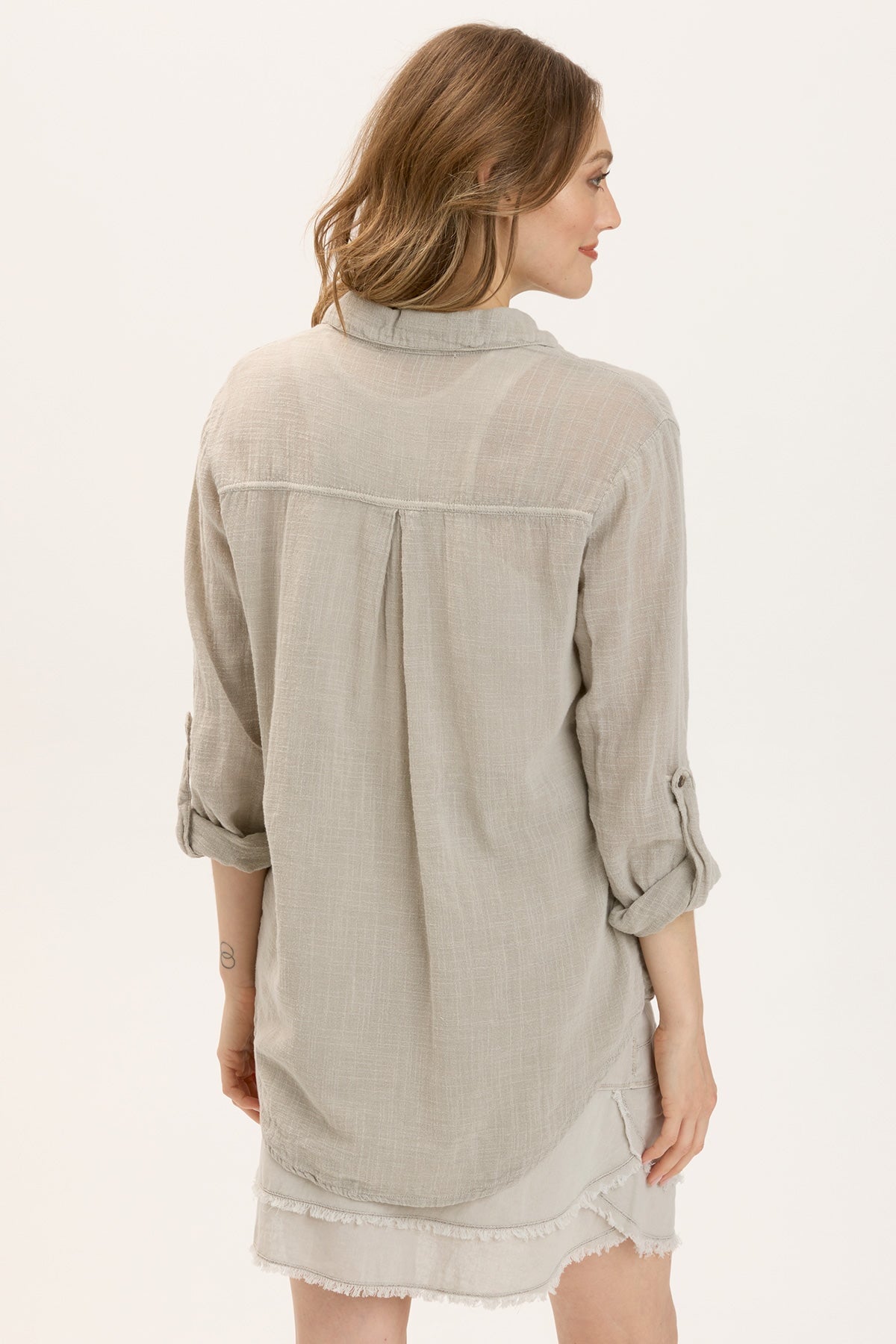 This gauze button-up blouse is great for layering. Features tabbed sleeve for easy rolling, curved hemline, and a box pleat on back.