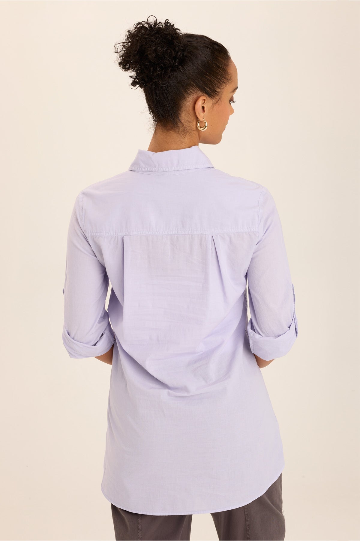 A classic XCVI body brought back to delight with a long tunic style silhouette and a snap-up front closure. Featuring rollable tabbed sleeves, two welt breast pockets and a yoked back pleated panel.