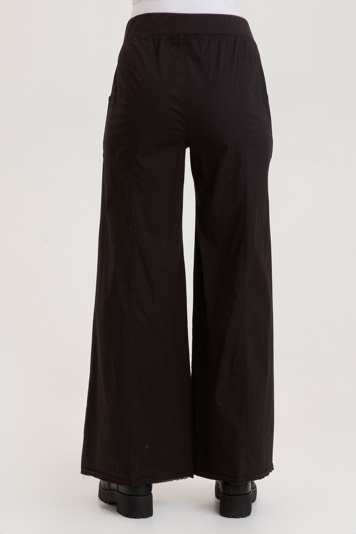 Wide leg, pull-on waist pant with brass hardware on front pockets and pleat details.