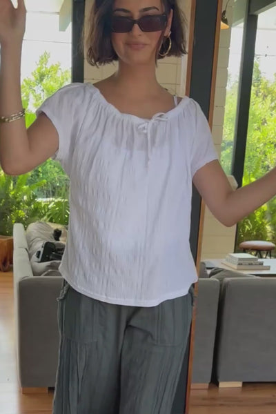 Cinched tie neck and a flutter sleeve are what give Selda its breezy look.