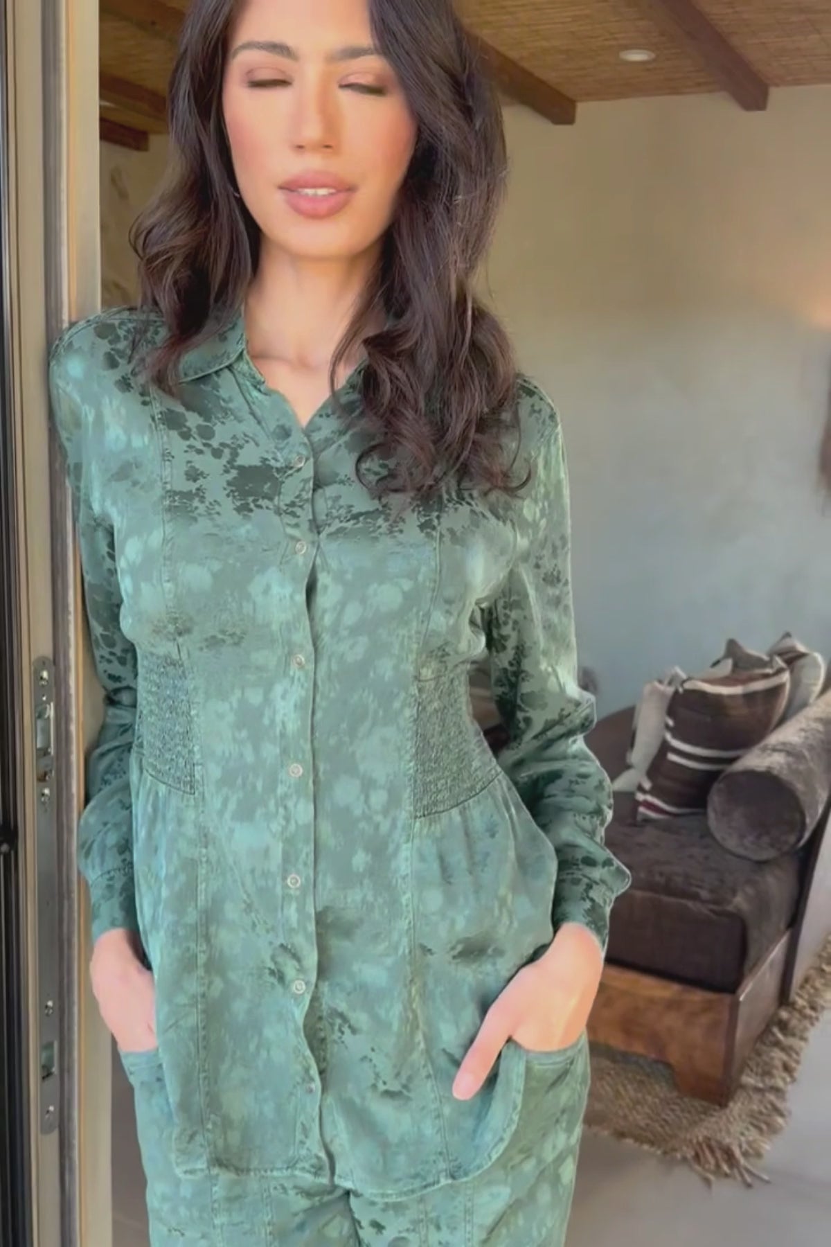 Senneca Textured Satin Shirred Peplum Button-Up Blouse in Ocean Storm Pigment