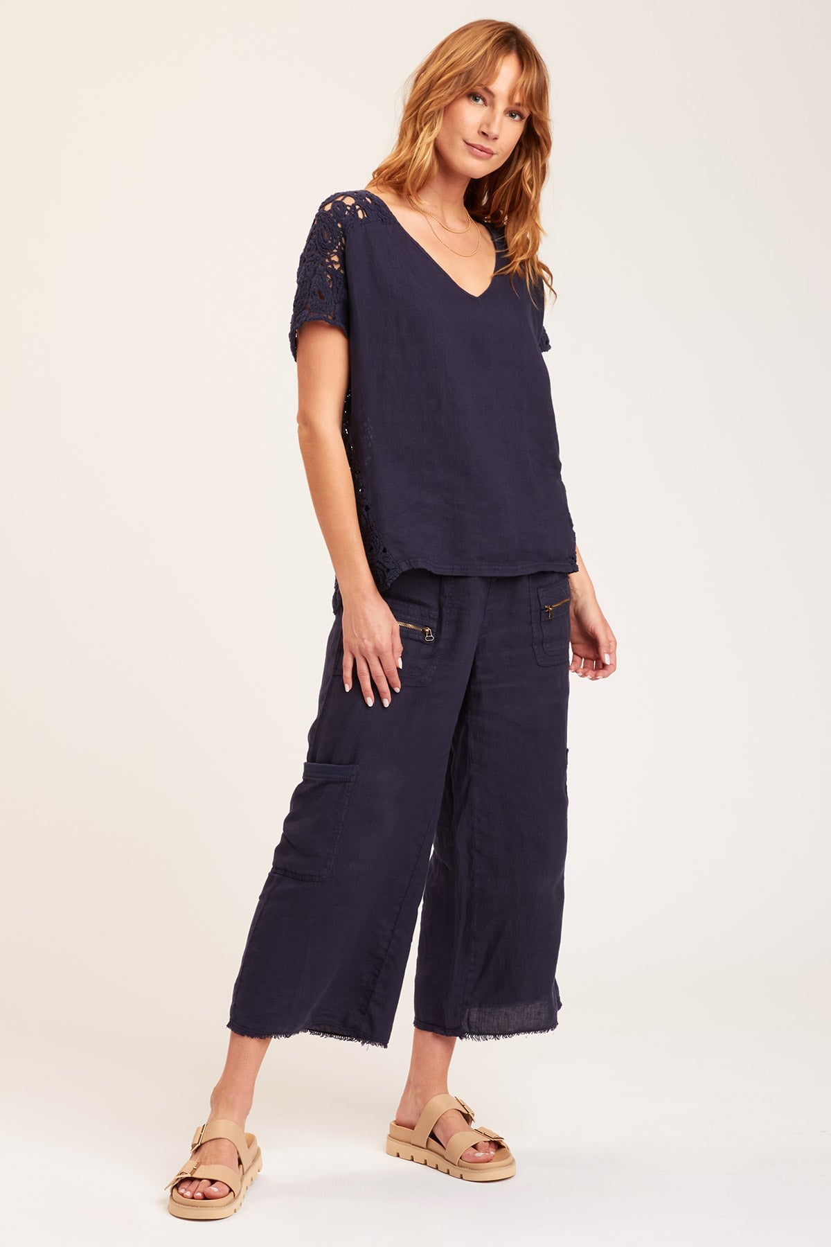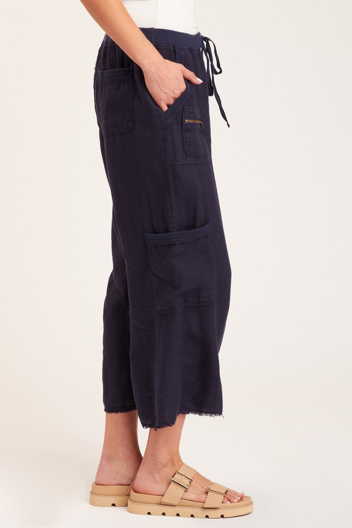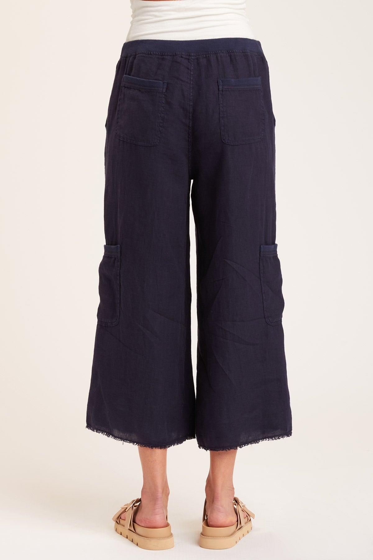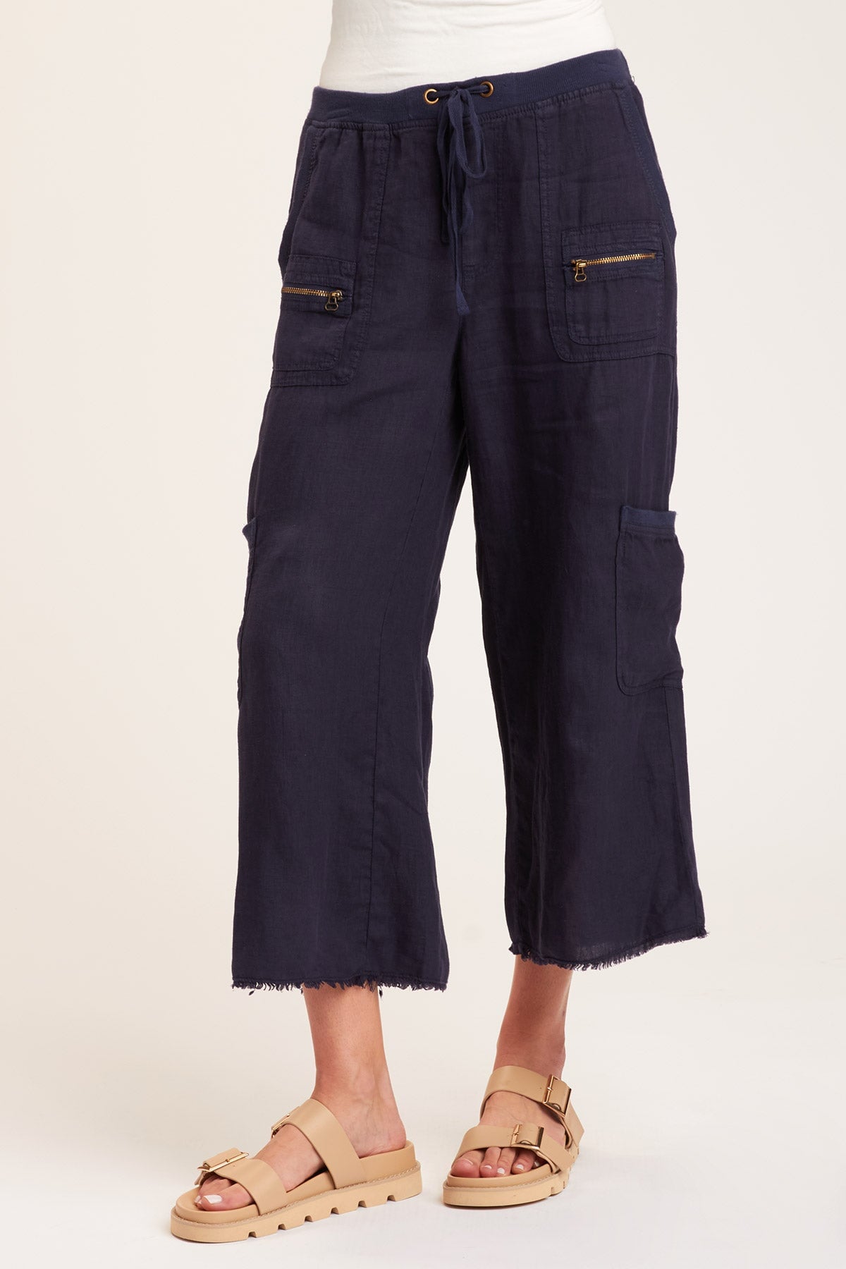 A drawstring waist and a flare leg pair up with a couple cargo pockets and mini zipper pocket details. Topped off with good 'ol front and back pockets plus raw edge on the leg opening, Staccia Gaucho is an easy winner.