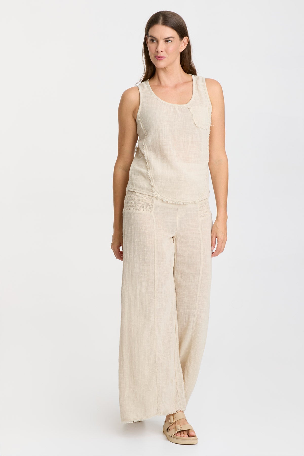 A scoop neck style in Cocoon Gauze, Treasure brings the pleasure! Forward pitched seams with a circular hem, raw-edging on the front, back, and around the patch pocket, plus contrasting slub jersey side panels for added comfort and ease-of-wear elevate the look.