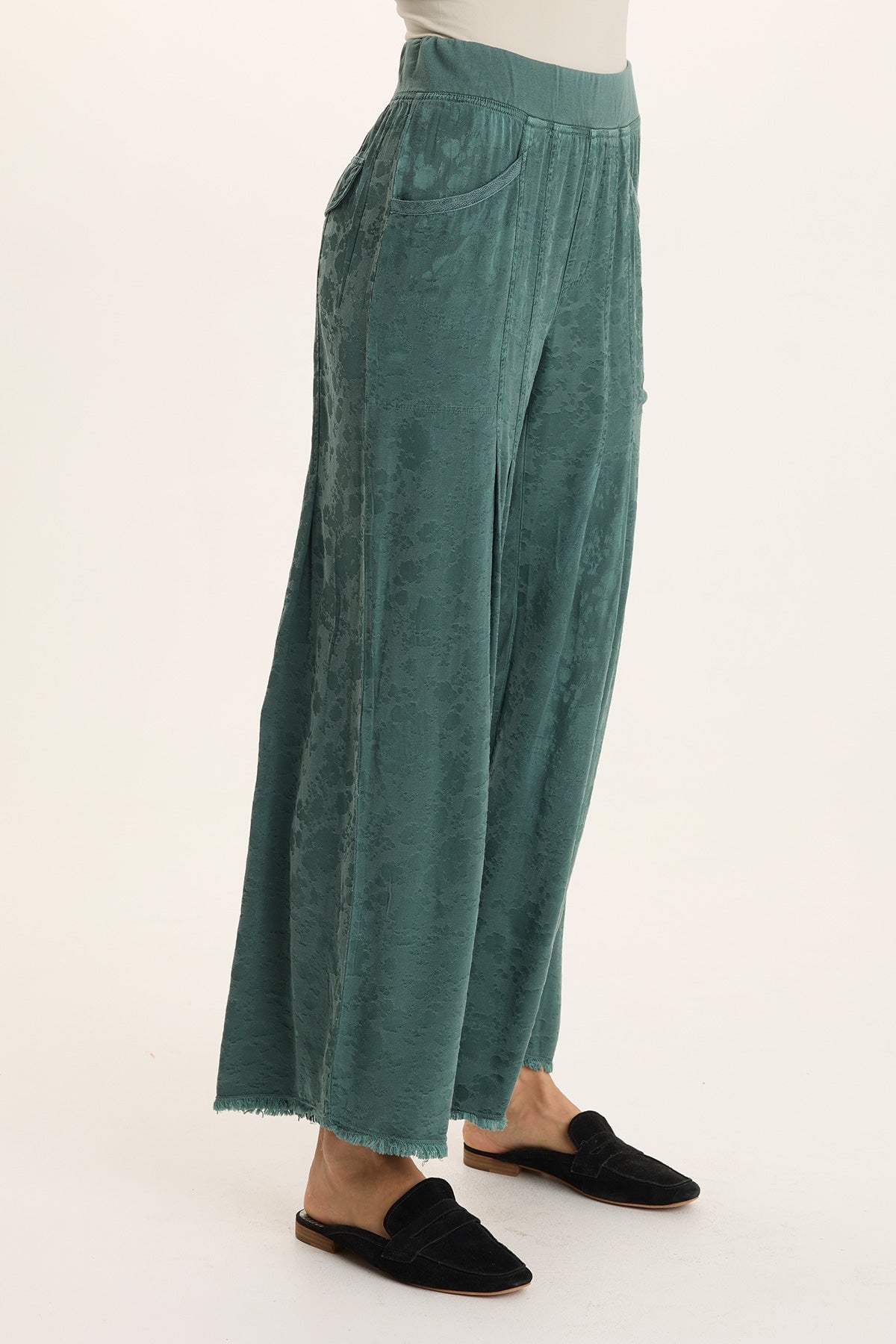 Cozy and casual yet statement-making in floral textured satin, the Twaina Wide Leg features pleating for soft volume, hip pockets and a pull-on waist for ease and function, and distressing at the hem for some unexpected detail.