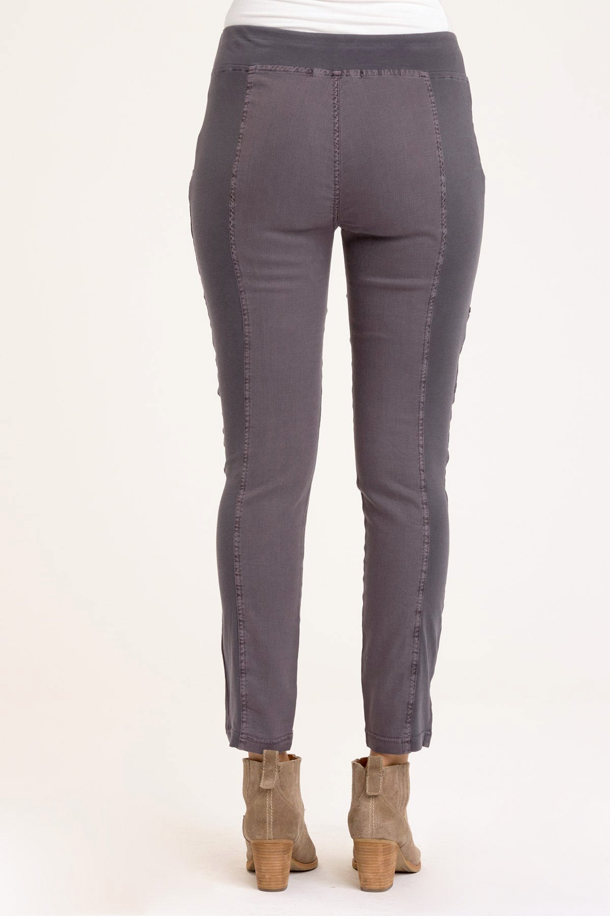 Elevate comfort and style in this newly updated Tencel Twill pant, showcasing jersey side inserts for a flawless fit. An elastic jersey pull-on waistband, dual front pockets, a discreet side zip pocket, and ruching on the front legs for added flair come together in this go-to style.