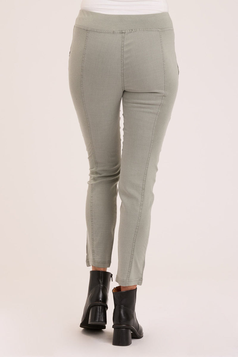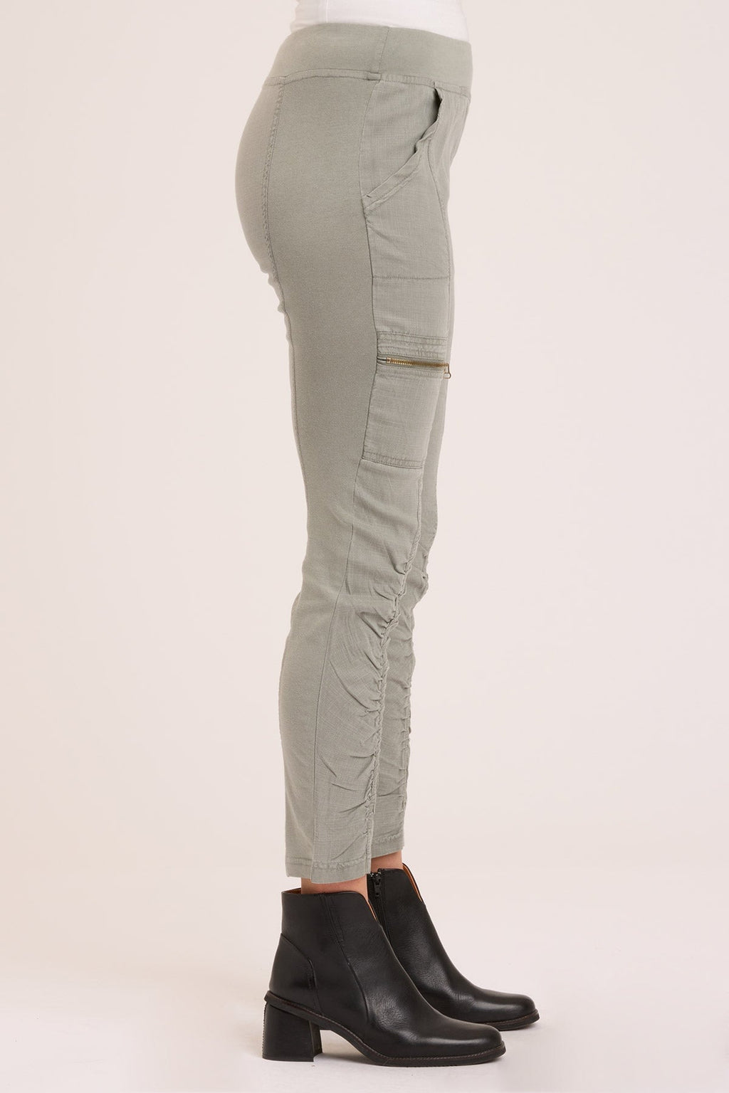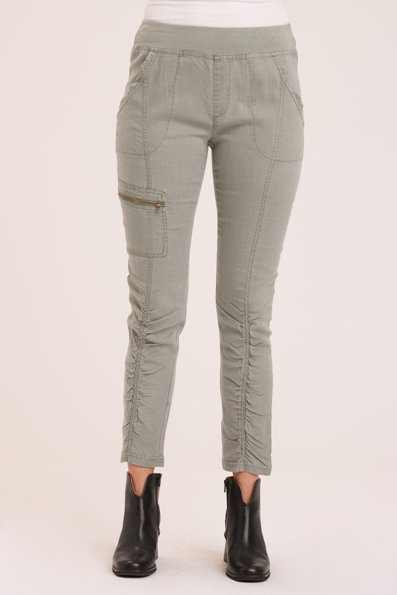Elevate comfort and style in this newly updated Tencel Twill pant, showcasing jersey side inserts for a flawless fit. An elastic jersey pull-on waistband, dual front pockets, a discreet side zip pocket, and ruching on the front legs for added flair come together in this go-to style.