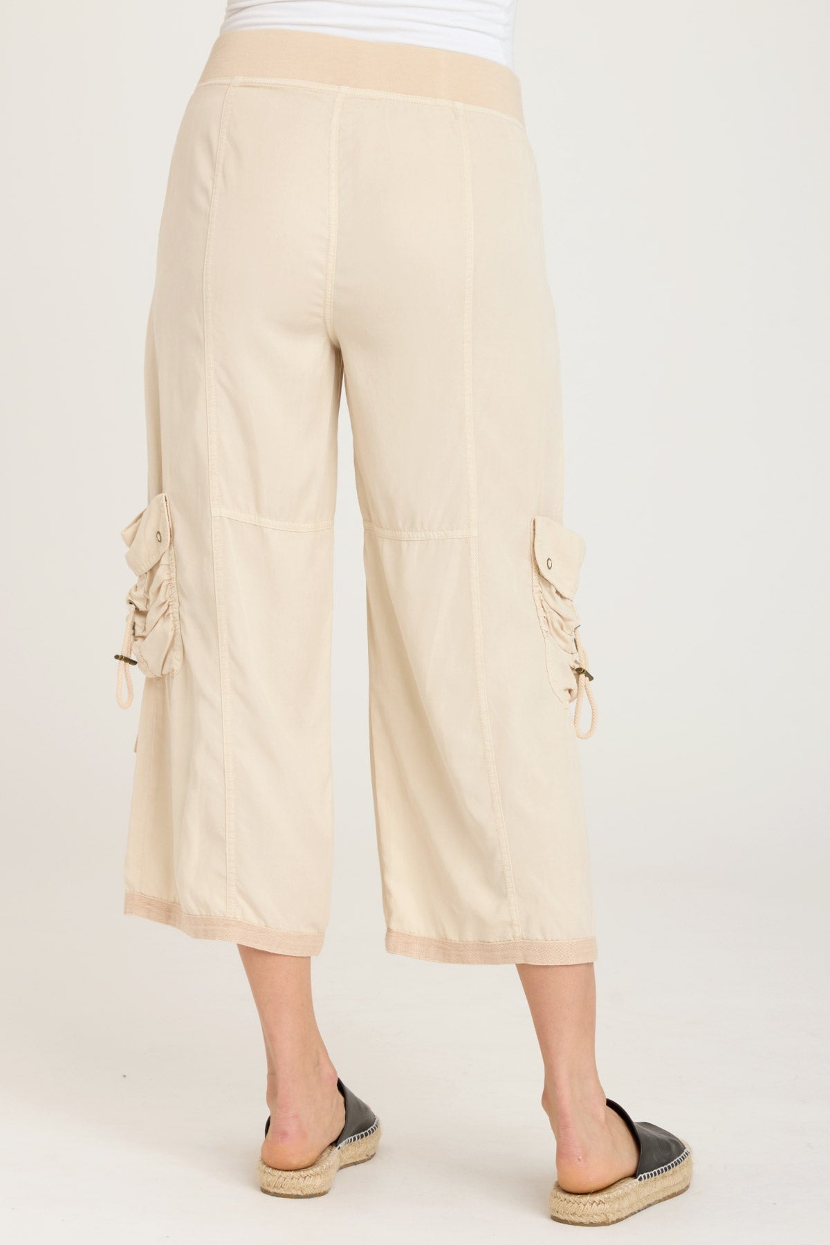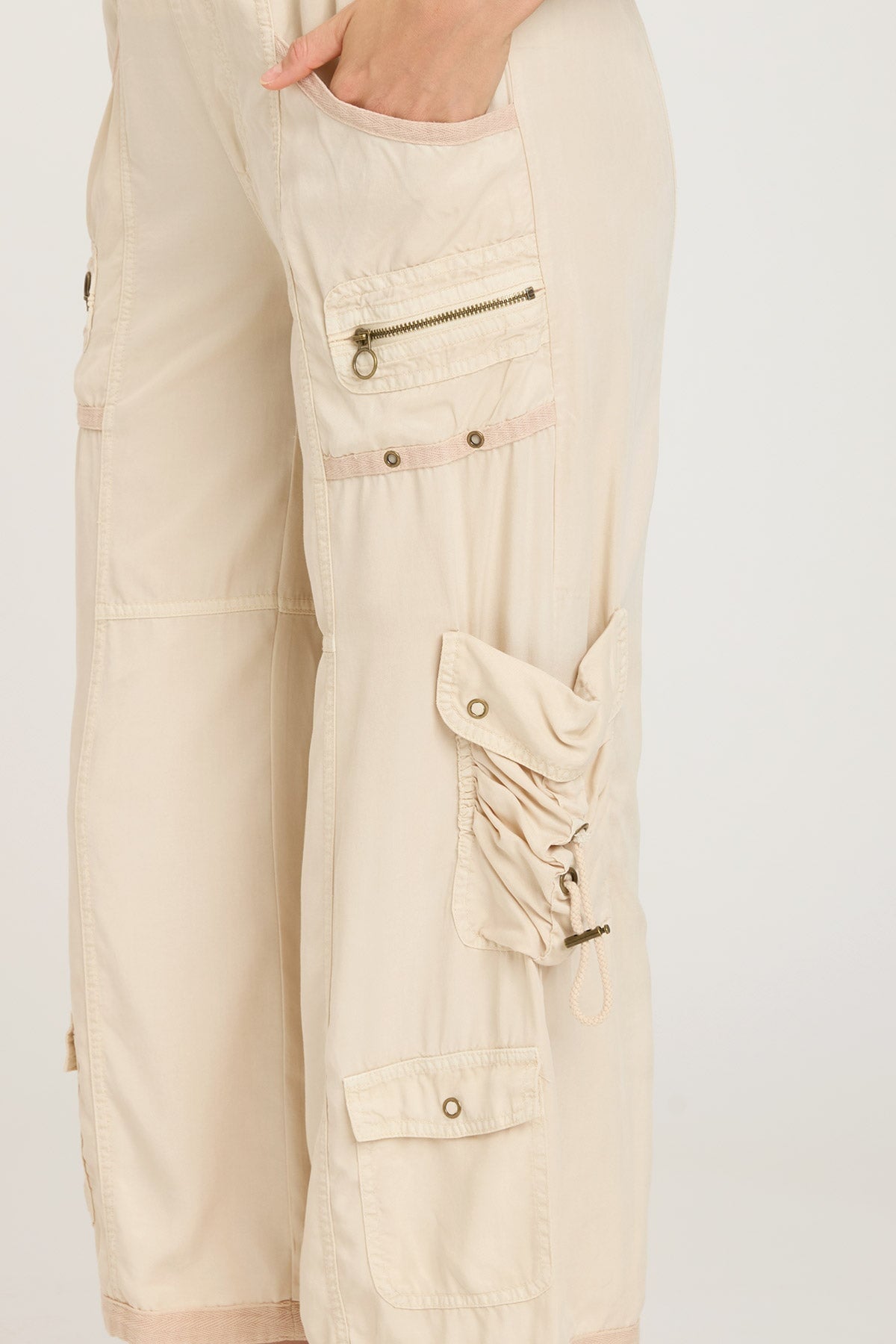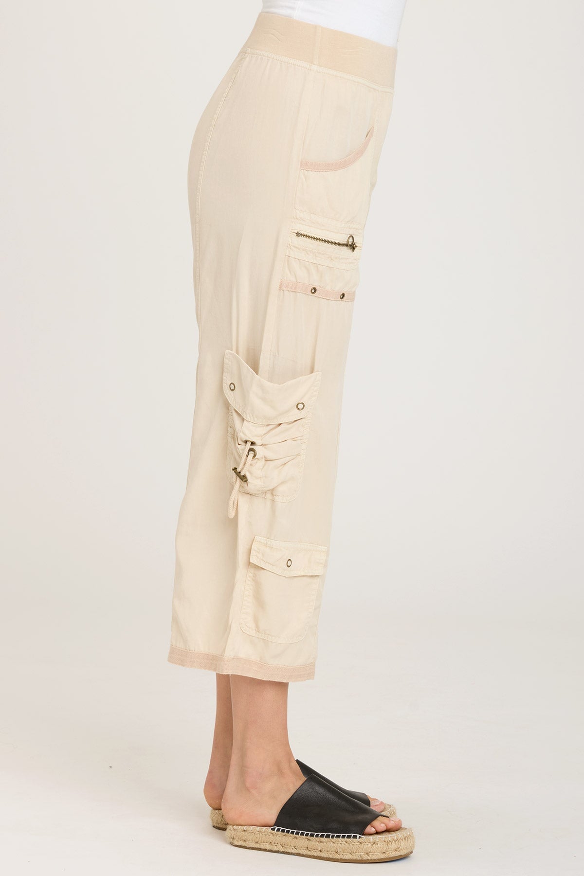 Contrasting trim along the pockets and hem add dimension to Yana’s wide-leg look, while pockets of every kind adorn this crop, complete with antique brass hardware for that perfect utility cargo look.
